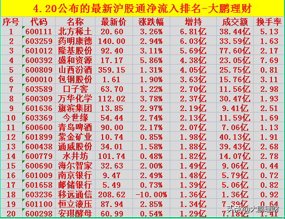重磅消息!4月16日刚刚公布的北向资金沪股通净流入排行榜,看看有没有你的持仓股: