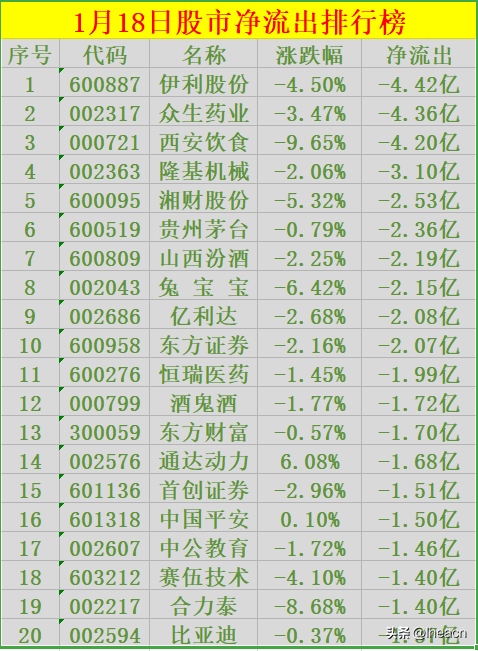 1.主力净流出:1月18日股市主力净流出排行榜,看看有没有你的持仓股:今日沪深两市主力机构净流出前20大个股排行榜:序号 代码 名称 涨跌幅 净流出1 600887 伊利股份 -4.50% -4.42亿2 002317 众生药业 -3.47% -4.36亿3 000721 西安饮食 -9.65% -4.20亿4 002363 隆基机械 -2.06% -3.10亿5 600095 湘财股份 -5.32% -2.53亿6 600519 贵州茅台 -0.79% -2.36亿7 600809 山西汾酒 -2.25% -2.19亿8 002043 兔 宝 宝 -6.42% -2.15亿9 002686 亿利达 -2.68% -2.08亿10 600958 东方证券 -2.16% -2.07亿11 600276 恒瑞医药 -1.45% -1.99亿12 000799 酒鬼酒 -1.77% -1.72亿13 300059 东方财富 -0.57% -1.70亿14 002576 通达动力 6.08% -1.68亿15 601136 首创证券 -2.96% -1.51亿16 601318 中国平安 0.10% -1.50亿17 002607 中公教育 -1.72% -1.46亿18 603212 赛伍技术 -4.10% -1.40亿19 002217 合力泰 -8.68% -1.40亿20 002594 比亚迪 -0.37% -1.37亿更多请关注