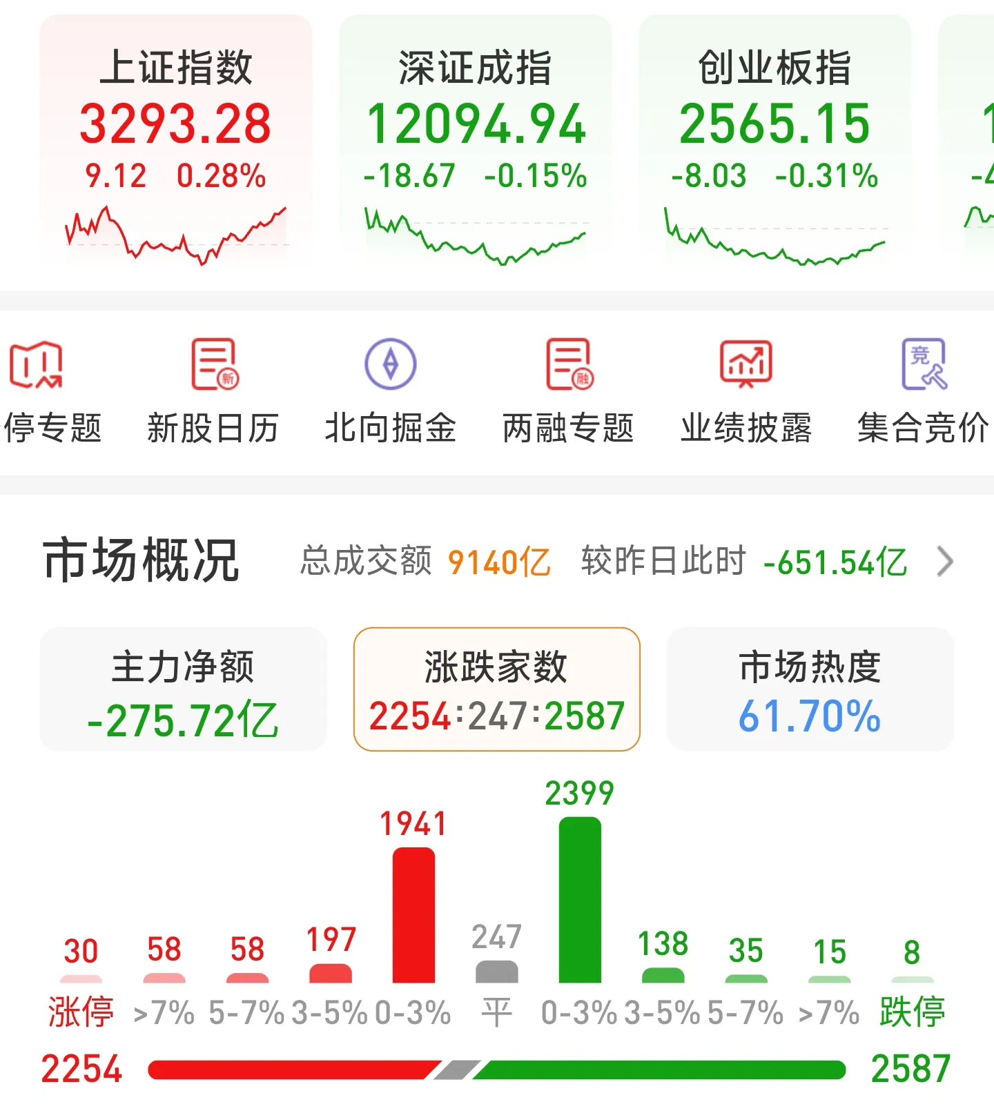 2.大盘情况:上证指数上涨0.28百分点,报3293.28深成指下跌0.15百分点, 报12094.94创业板指下跌0.31百分点,报2565.15总体上个股跌多涨少,两市2254只个股上涨,2587只下跌。
