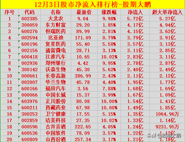 重磅消息!12月3日股市主力净流入排行榜,看看有没有你的持仓股: