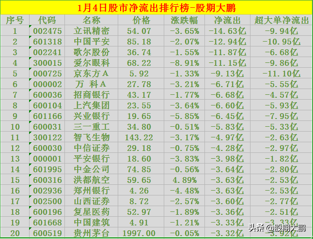 重磅消息!1月4日股市主力净流出排行榜,看看有没有你的持仓股:
