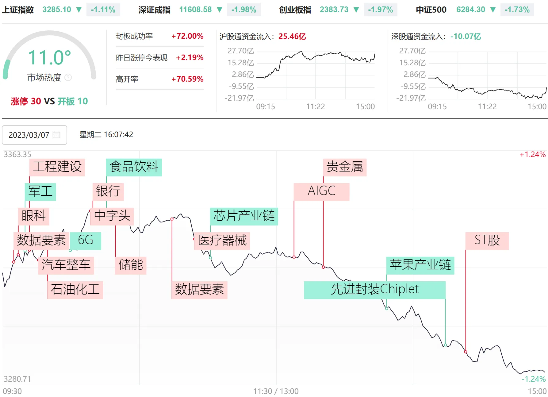 1.03.07收评,大盘指数低开低走,早盘冲高回落,午后资金大幅出逃,市场情绪全天低迷。