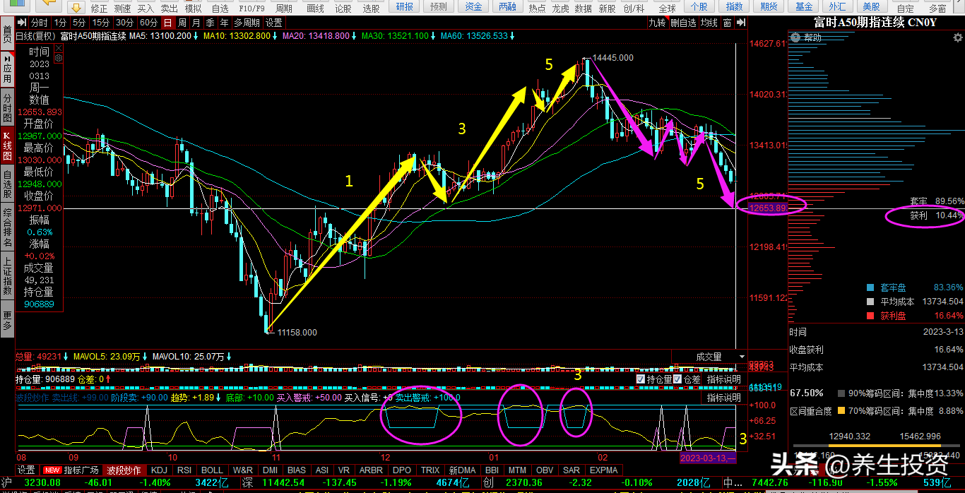 6.其中大波段冲顶时,曾及时做出了分享,认为14200点附近是大波段顶部区域,实际上的大波段高点是14500点,相差一个日间波动步幅300点。