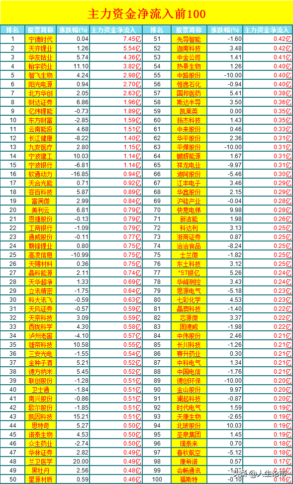 3月15日:主力资金净流入前100: