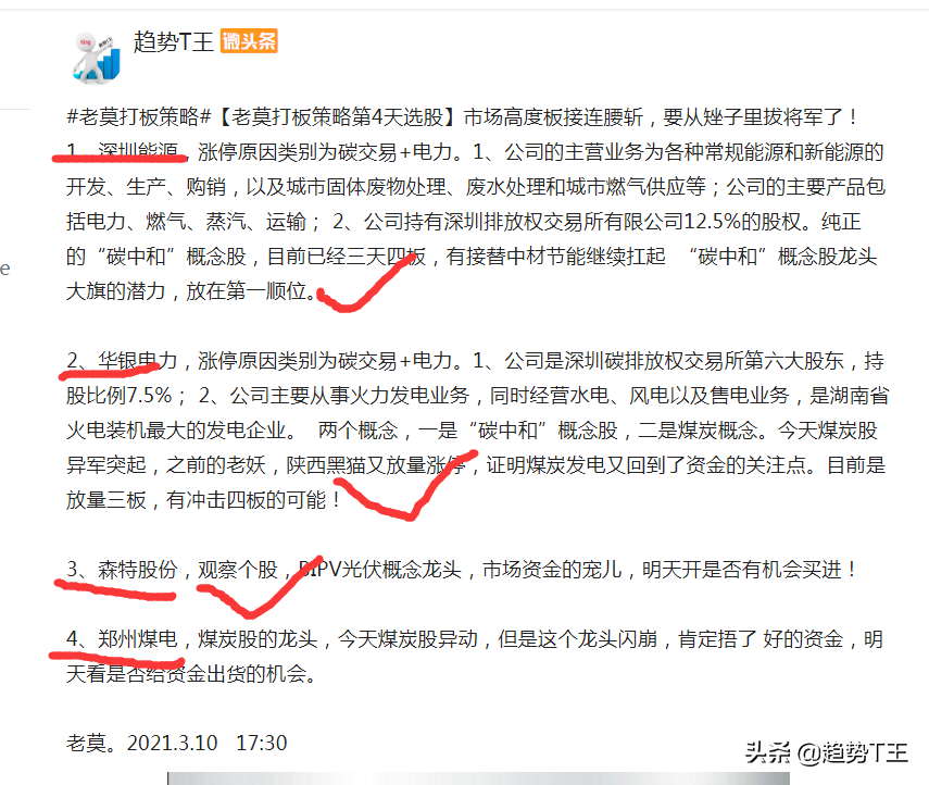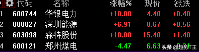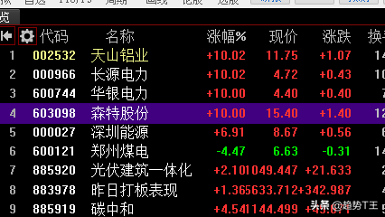 7.3、深圳能源,今天两次冲板失败,也处于放量成交状态,报收6.91%,今天的走势不是很强势,“碳中和”老龙头中材节能封板后,这个新龙头有点胆怯的样子,主动让出龙头地位,希望明天能强势一点,毕竟你持有深圳碳排放交易所12.5%的股份,持有7.5股份的华银电力都涨停了,你等啥那?4、郑州煤电,今天低开低走,一直震荡,不亏为龙头,多头一次次冲高回落,但是今天属于缩量状态,明天反包的可能也会存在,毕竟这两天流行反包!今日继续寻找打板股【老莫打板策略第5天复盘】,“碳中和”跑不了,今日的“电解铝”成为大热点。
