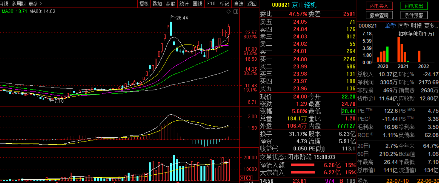 今天先说老妖,赣能股份一字跌停,恒大高新大幅低开。但是宝馨科技,竞价从跌停到接近翻红,大连重工更是从低位翻红。随后,宝馨科技直线下跌,导致老妖跟跌,HJT跟跌,京山轻机瞬间跌停。看起来很恐慌,但实际上,机会来了。机会在HJT板块,东风日升斜线拉升,钧达股份和拓日新能也都跟随上涨,京山轻机反复撬板,终于撬开。