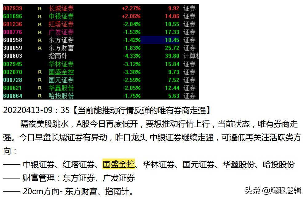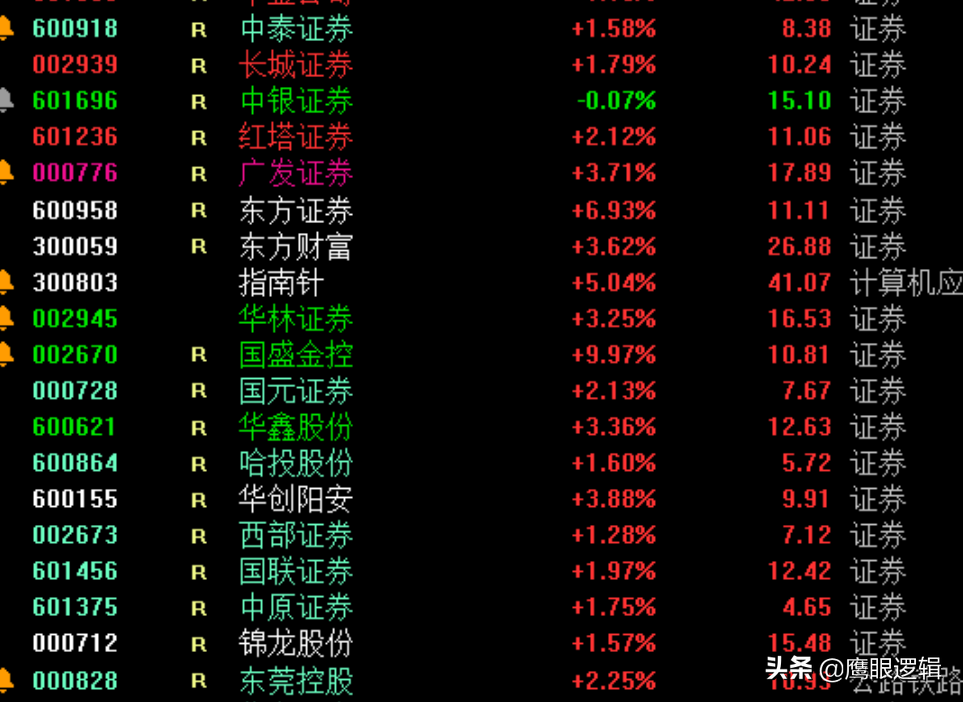 1.【机构套利因素,导致A股太难了! 券商发力拉升,但宁王立马跳水,这是为何?】昨晚热点解析栏目分析,降准利好地产、券商银行保险等大金融方向,今日早盘市场略作洗盘之后,开始全面拉升,券商成为主力军,这也符合主力逻辑核心观点:货币政策利好预期,有利于大金融主板低位蓝筹成为市场反攻主线之一!券商今日上涨路线图,依然以实战直播近期反复发布的系列活跃品种为主:—— 活跃龙头系列:国盛金控,也是短线掘金系列品种,今日强势封板,再创新高;中银证券由于股东大减持,短期转弱; 华林证券、国元证券、红塔证券、华鑫股份、华创阳安、哈投股份 均为活跃系列。