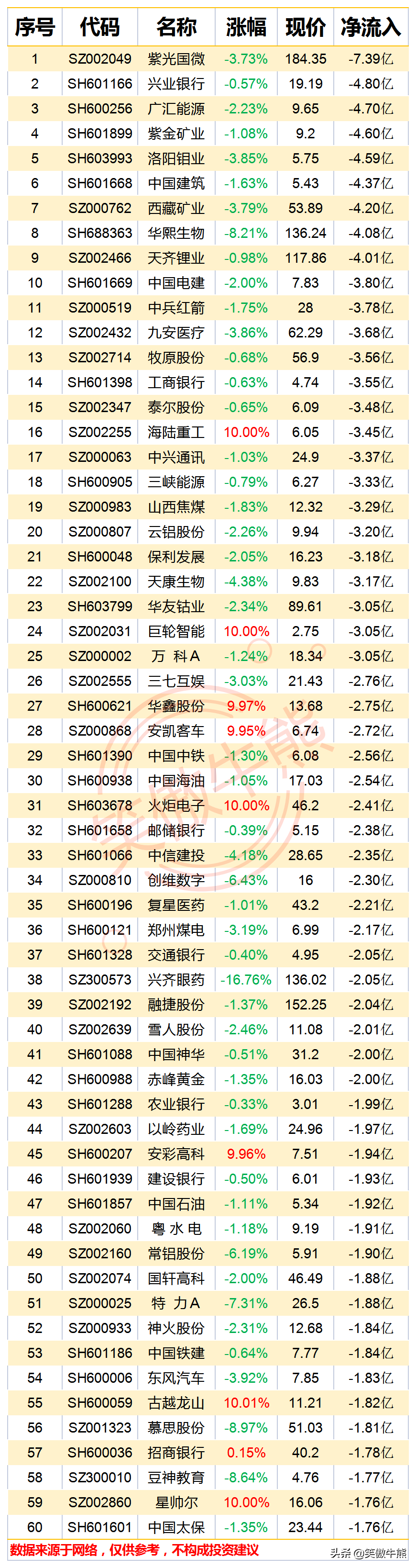 1.[2022.06.24]资金大幅流出前60股1 SZ002049 紫光国微 -7.39亿 2 SH601166 兴业银行 -4.80亿 3 SH600256 广汇能源 -4.70亿 4 SH601899 紫金矿业 -4.60亿 5 SH603993 洛阳钼业 -4.59亿 6 SH601668 中国建筑 -4.37亿 7 SZ000762 西藏矿业 -4.20亿 8 SH688363 华熙生物 -4.08亿 9 SZ002466 天齐锂业 -4.01亿 10 SH601669 中国电建 -3.80亿 11 SZ000519 中兵红箭 -3.78亿 12 SZ002432 九安医疗 -3.68亿 13 SZ002714 牧原股份 -3.56亿 14 SH601398 工商银行 -3.55亿 15 SZ002347 泰尔股份 -3.48亿 16 SZ002255 海陆重工 -3.45亿 17 SZ000063 中兴通讯 -3.37亿 18 SH600905 三峡能源 -3.33亿 19 SZ000983 山西焦煤 -3.29亿 20 SZ000807 云铝股份 -3.20亿 21 SH600048 保利发展 -3.18亿 22 SZ002100 天康生物 -3.17亿 23 SH603799 华友钴业 -3.05亿 24 SZ002031 巨轮智能 -3.05亿 25 SZ000002 万 科A -3.05亿 26 SZ002555 三七互娱 -2.76亿 27 SH600621 华鑫股份 -2.75亿 28 SZ000868 安凯客车 -2.72亿 29 SH601390 中国中铁 -2.56亿 30 SH600938 中国海油 -2.54亿
