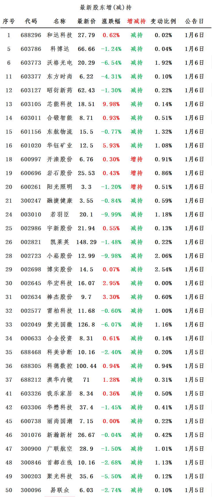 1.多家公司发布减持公告,最新股东增(减)持个股名单公布:更新日期:1月7日序号 代码 名称1 688296 和达科技5 603786 科博达6 603773 沃格光电11 603377 东方时尚12 603127 昭衍新药13 603105 芯能科技14 603011 合锻智能15 601156 东航物流16 601020 华钰矿业18 600997 开滦股份19 600696 岩石股份20 600261 阳光照明21 300247 融捷健康24 003010 若羽臣25 002986 宇新股份26 002821 凯莱英28 002723 小崧股份29 002698 博实股份30 002645 华宏科技31 002634 棒杰股份32 002577 雷柏科技33 002049 紫光国微34 000633 合金投资35 688468 科美诊断36 688305 科德数控37 688212 澳华内镜41 603326 我乐家居42 603306 华懋科技45 600738 丽尚国潮46 301076 新瀚新材47 300900 广联航空48 300846 首都在线49 300203 聚光科技50 300096 易联众结论:每天定时更新!