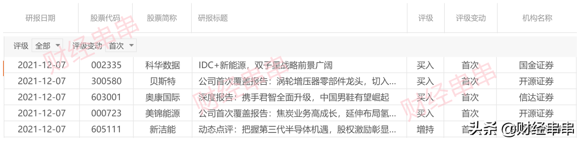 1.机构研报首次评级分享:12月7日个股研报简读、逻辑分享科华数据:IDC+新能源,双子星战略前景广阔1.业务转型成功,产品创新、供应链管理与解决方案构成核心优势2.数据中心定位准确,绑定大客户,“双碳”政策核心受益3.智慧电源产品优势稳固,高端产品和制造工艺稳定毛利率4.新能源业务市场空间广阔,出海与小机型产品拓展计划提供业绩增长弹性贝斯特:涡轮增压器零部件龙头,切入新能源赛道前景可期1.涡轮增压器核心零部件龙头供应商,切入新能源赛道前景可期2.深耕涡轮增压零部件领域,业绩维持稳定增长3.外延并购有序开展,新能源业务打开成长空间奥康国际:携手君智全面升级,中国男鞋有望崛起1.国产皮鞋行业龙头,多年沉淀酝酿升级2.行业持续低迷,竞争格局分散,细分龙头有望突围3.君智助力全面升级,男鞋国货品牌呼之欲出4.轻装上阵去库存,快反供应链与智能仓储全链路增效美锦能源:焦炭业务高成长,延伸布局氢能产业链1.焦化主业:供给格局优化致使行业高景气,量价齐升释放业绩弹性2.新能源业务:氢能产业链全布局,未来成长空间广阔,带来新的业绩增长点新洁能:把握第三代半导体机遇,股权激励彰显信心 1.事件推动,新洁能发布定增预案公告,拟募集资金 14.5 亿元;公司发布股票激励计划(草案),授予价格为 84.25 元/股2.抓住宽禁带半导体功率器件市场机遇,优化产品结构,增强实力3.横向开拓市场,功率驱动 IC、IPM 与功率器件主业协同发展郑重声明:本文仅为个人对个股研报的简读记录,不构成投资建议!不具有任何指导作用!股市有风险,投资需要谨慎!好的,今天就分享这些。