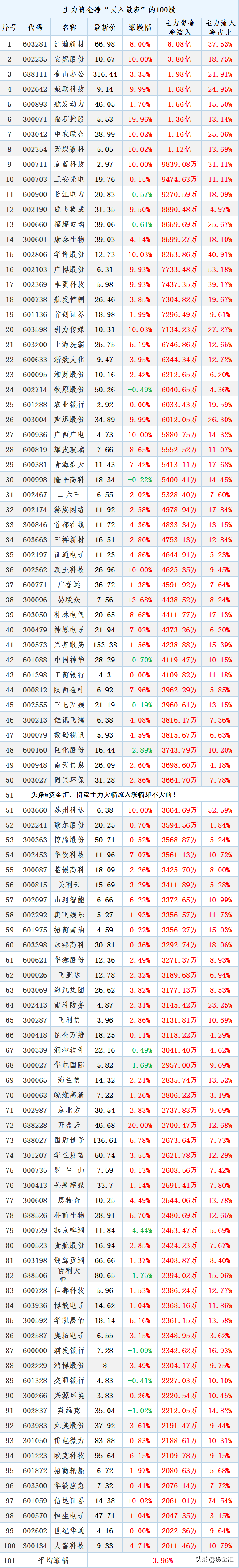 主力净流入最多的是江瀚新材,流入8.08亿居首,同时涨幅为8.0%;