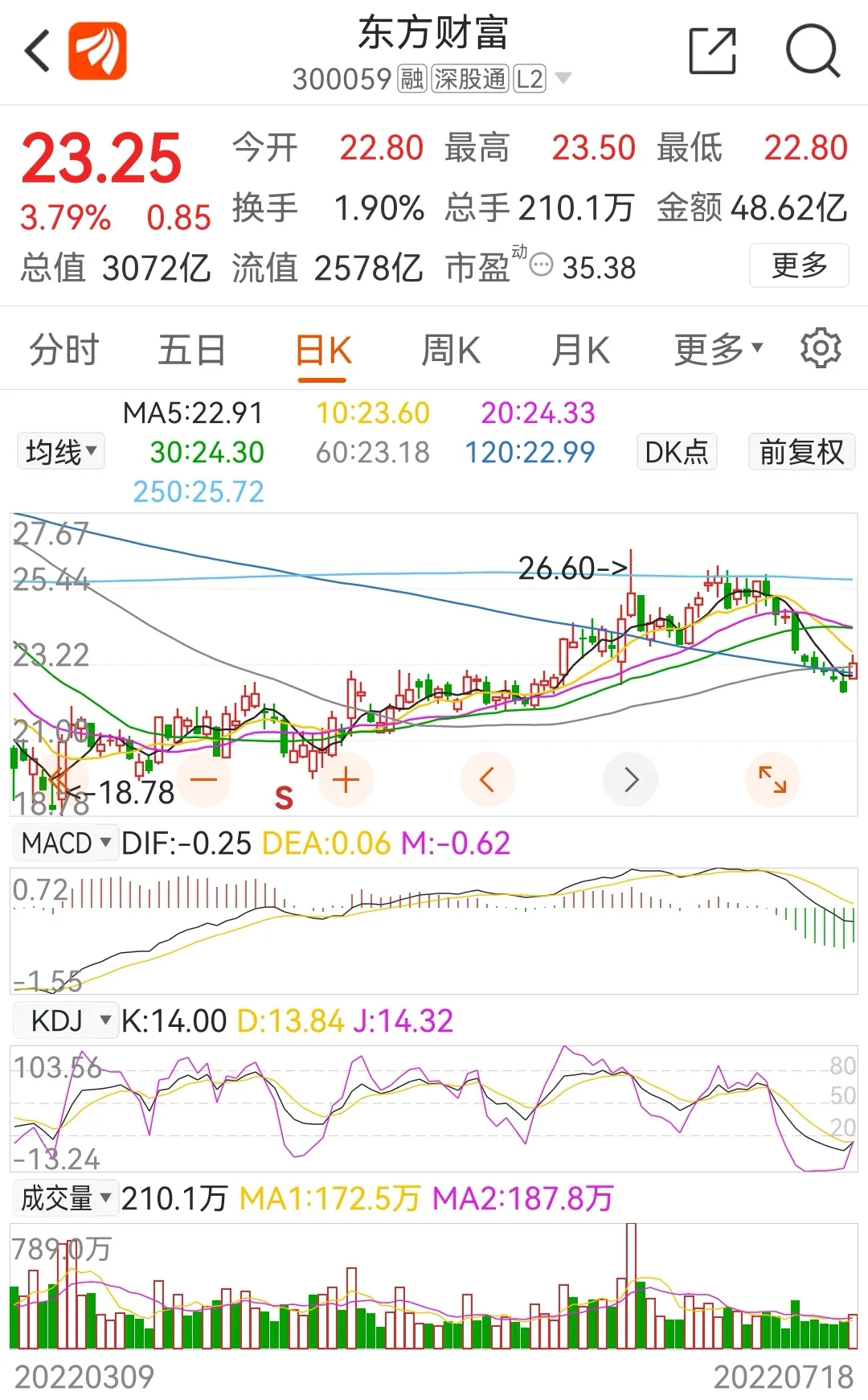 1.东方财富今日上涨3.79%,收盘报价为23.25元。