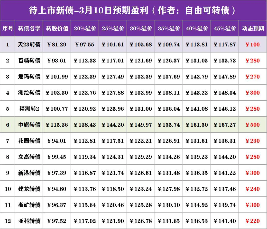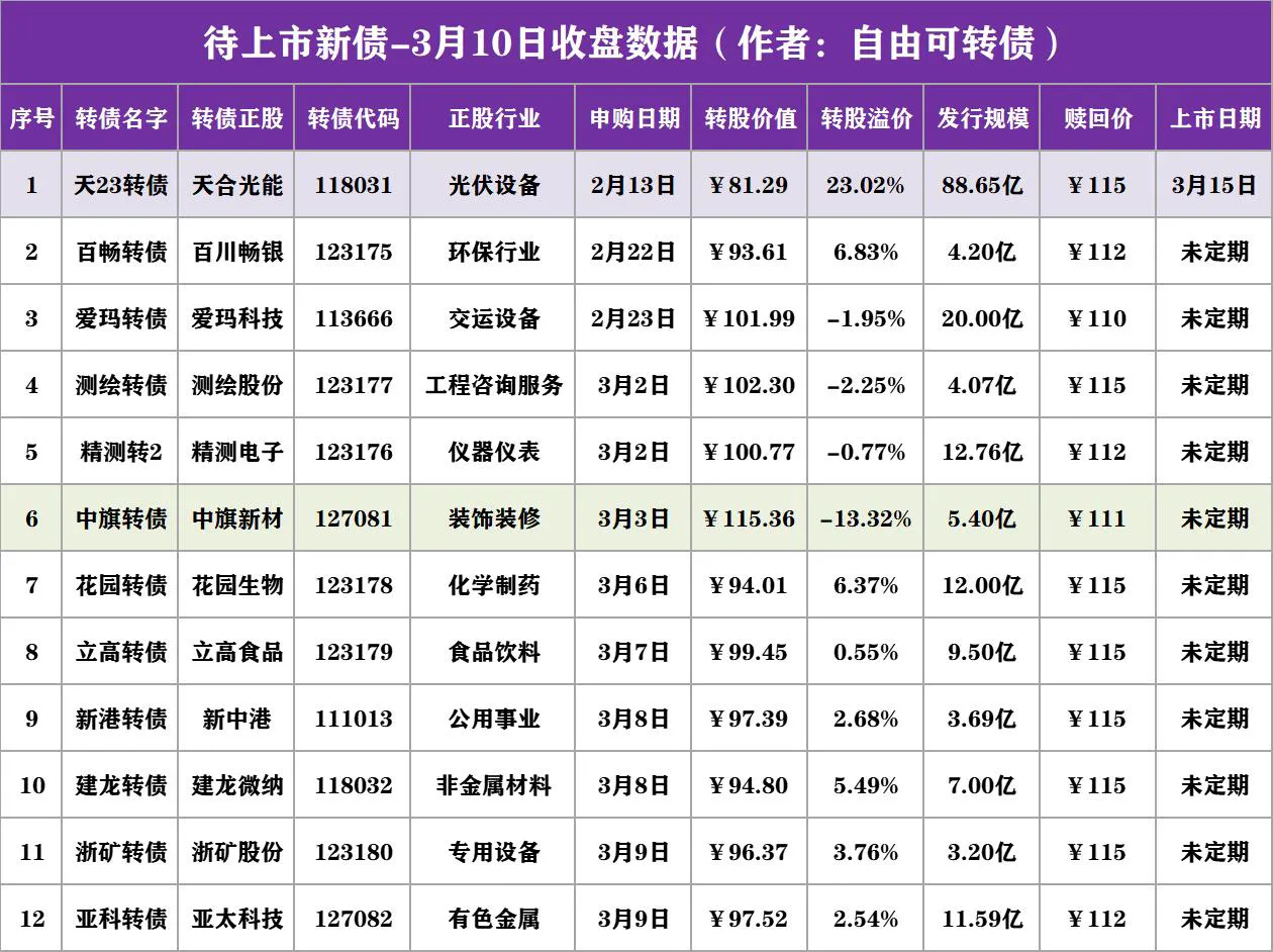 1.【动态预测】待上市转债,3月10日收盘数据及实时动态价值分析!简单提要:天23转债将与3月15日(周三)上市。