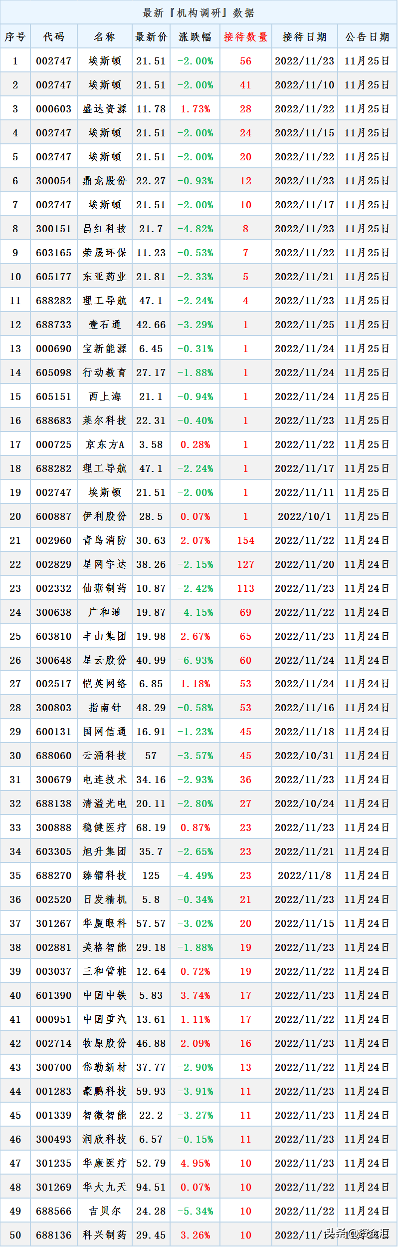 1.一家公司被56家机构调研,最新“机构调研”个股数据!更新日期:25日收盘序号 代码 名称1 002747 埃斯顿2 002747 埃斯顿3 000603 盛达资源4 002747 埃斯顿5 002747 埃斯顿6 300054 鼎龙股份7 002747 埃斯顿8 300151 昌红科技9 603165 荣晟环保10 605177 东亚药业11 688282 理工导航12 688733 壹石通13 000690 宝新能源14 605098 行动教育15 605151 西上海16 688683 莱尔科技17 000725 京东方A18 688282 理工导航19 002747 埃斯顿20 600887 伊利股份21 002960 青鸟消防22 002829 星网宇达23 002332 仙琚制药24 300638 广和通25 603810 丰山集团26 300648 星云股份27 002517 恺英网络28 300803 指南针29 600131 国网信通30 688060 云涌科技31 300679 电连技术32 688138 清溢光电33 300888 稳健医疗34 603305 旭升集团35 688270 臻镭科技36 002520 日发精机37 301267 华厦眼科38 002881 美格智能39 003037 三和管桩40 601390 中国中铁41 000951 中国重汽42 002714 牧原股份43 300700 岱勒新材44 001283 豪鹏科技45 001339 智微智能46 300493 润欣科技47 301235 华康医疗48 301269 华大九天49 688566 吉贝尔50 688136 科兴制药结论:每天定时更新!