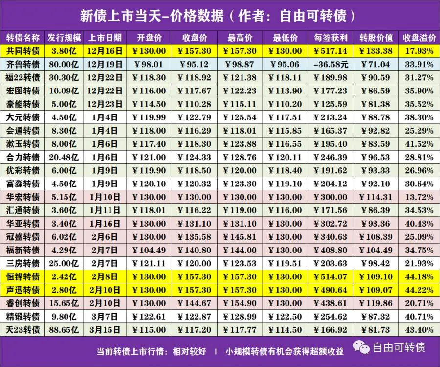 新债上市行情:近期上市的22只转债,共有“共同转债、华宏转债、华亚转债、冠盛转债、福新转债、恒锋转债、声迅转债、睿创转债”的每签(每手/每10张)获利高于300元。其中“齐鲁转债”上市当天破发。