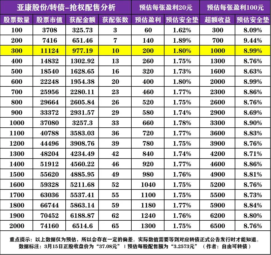 预估每股配售额为3.2573元,买入300股“亚康股份”的股票,未来“大概率”可获配10张转债。