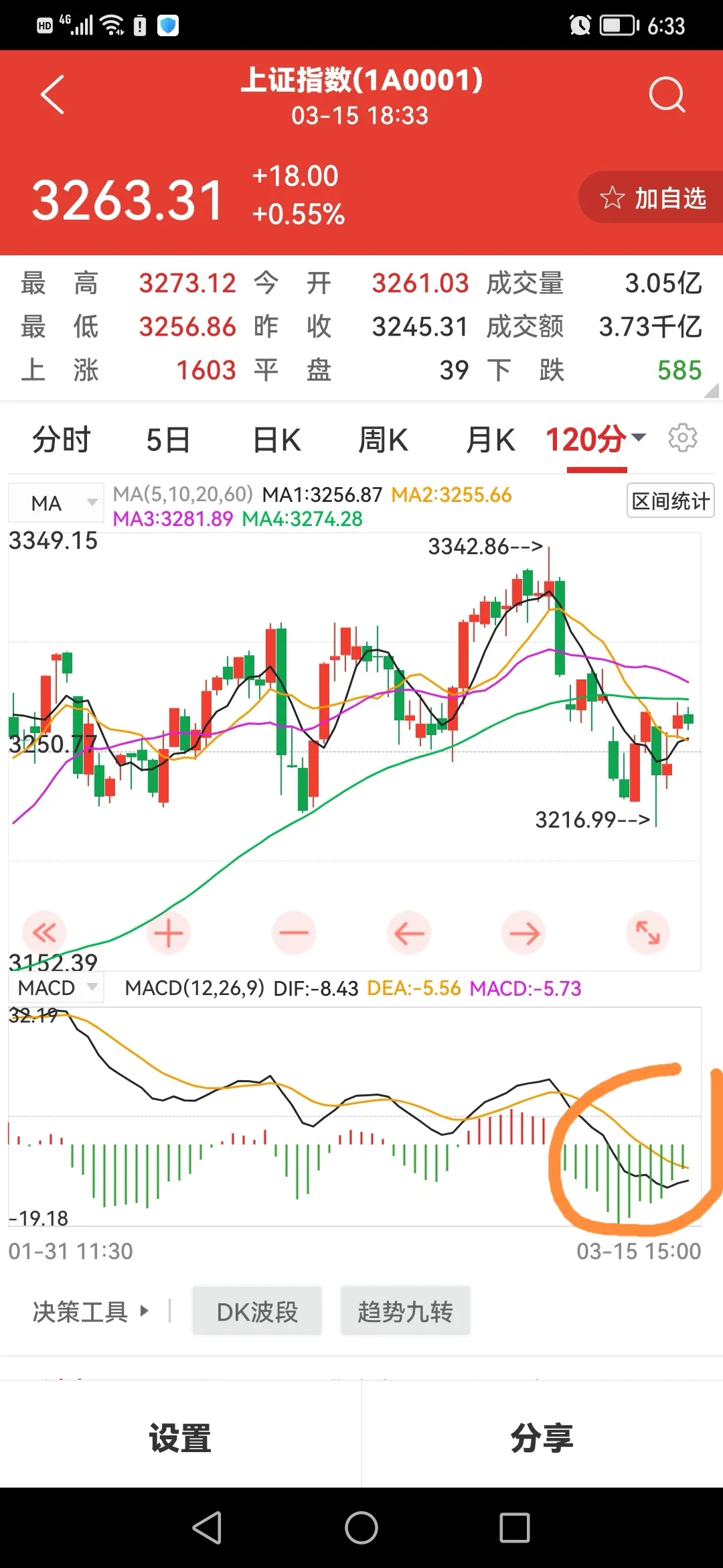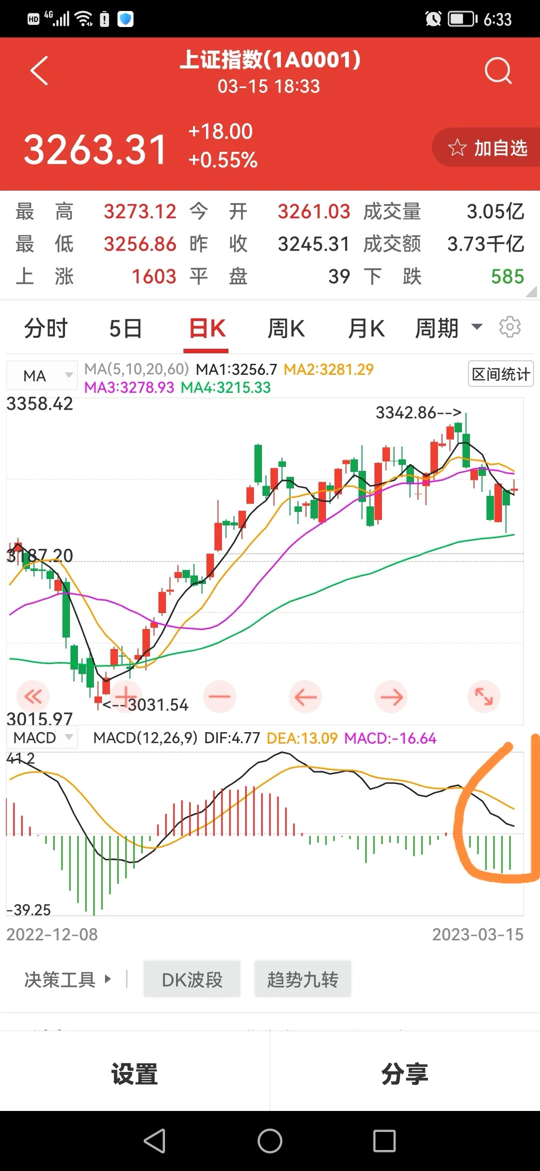 1.3月15日股市操作今天是星期三,本星期又去了三天,今天的大盘虽说涨了18个点,但涨的小心,涨的犹豫,只成交了8300亿不到,属缩量上涨。
