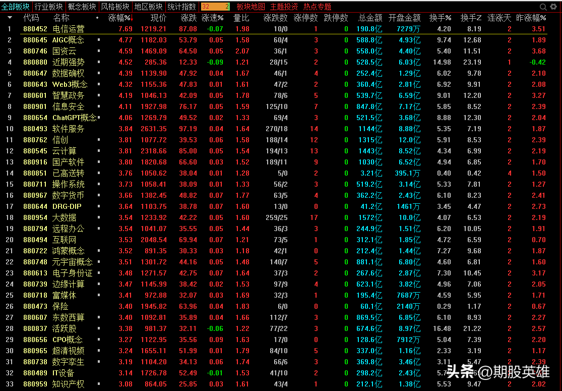 8.板块方面,国资云、数据要素、信创、ChatGPT等板块涨幅居前,纺织、眼科医疗、POE胶膜、医疗器械等板块跌幅居前。