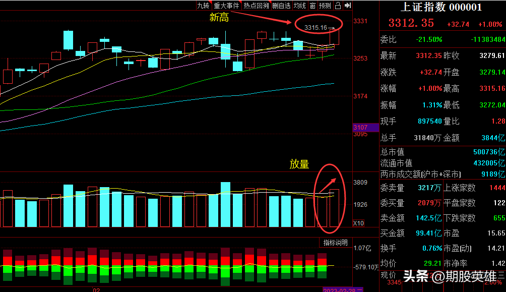 1.3月1日收评(近两天持续放量上涨,明天回调你敢入场吗?)今日大盘全天低开后震荡走高,三大指数均小幅上涨迎3月开门红,沪指站上3300点,创阶段收盘新高。