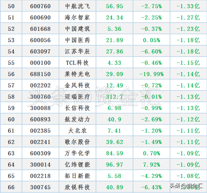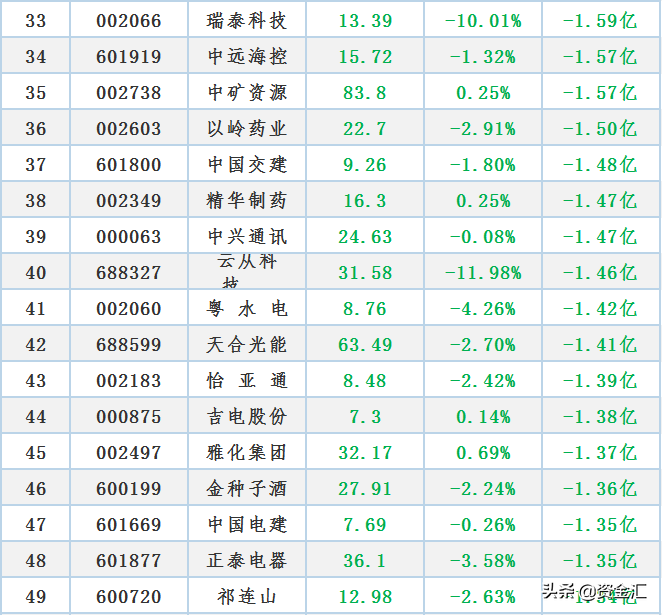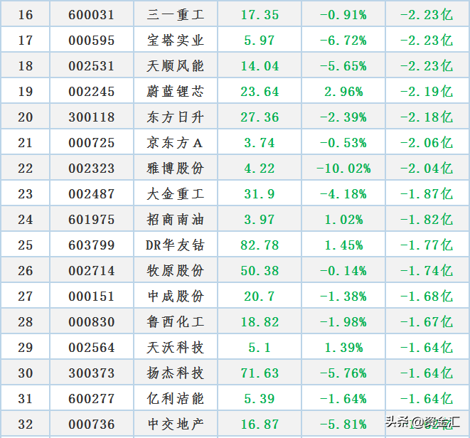 2.1 300750 宁德时代2 601985 中国核电3 002074 国轩高科4 600062 华润双鹤5 300274 阳光电源6 002709 天赐材料7 000756 新华制药8 601012 隆基绿能9 002432 九安医疗10 002624 完美世界11 002407 多氟多12 002056 横店东磁13 300059 东方财富14 601666 平煤股份15 600406 国电南瑞16 600031 三一重工17 000595 宝塔实业18 002531 天顺风能19 002245 蔚蓝锂芯20 300118 东方日升21 000725 京东方A22 002323 雅博股份23 002487 大金重工24 601975 招商南油25 603799 DR华友钴26 002714 牧原股份27 000151 中成股份28 000830 鲁西化工29 002564 天沃科技30 300373 扬杰科技31 600277 亿利洁能32 000736 中交地产33 002066 瑞泰科技34 601919 中远海控35 002738 中矿资源36 002603 以岭药业37 601800 中国交建38 002349 精华制药39 000063 中兴通讯40 688327 云从科技…41 002060 粤 水 电42 688599 天合光能43 002183 怡 亚 通44 000875 吉电股份45 002497 雅化集团46 600199 金种子酒47 601669 中国电建48 601877 正泰电器49 600720 祁连山50 600760 中航沈飞