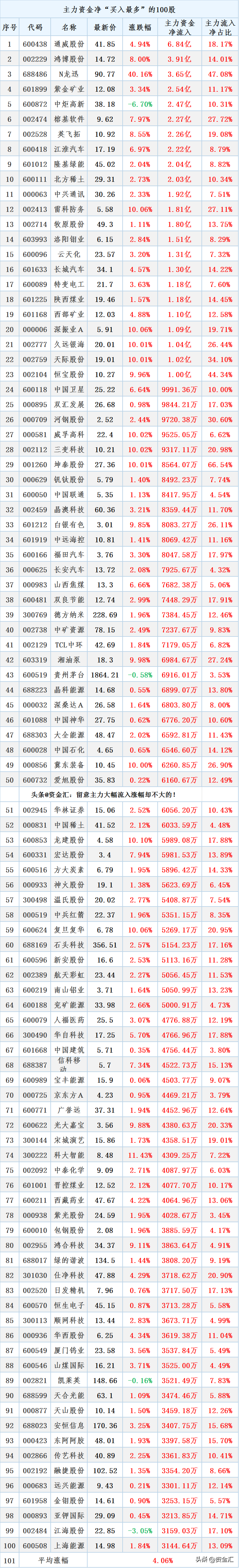 此外获得主力大幅买入的还有鸿博股份、N龙迅、紫金矿业等,净流入均超过2.5亿。