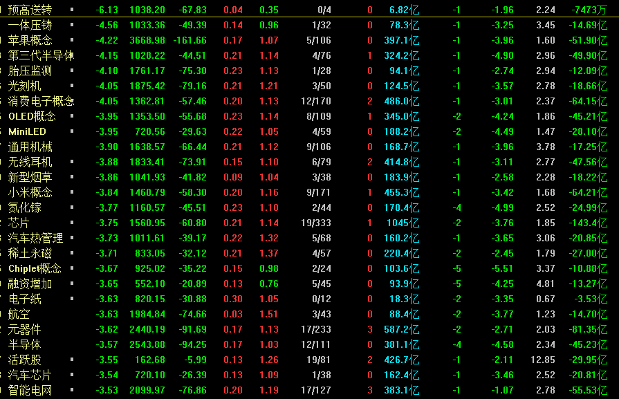 4.第三,其实今天A股这样杀跌,最大的根源还是板块轮动失败了,以及前期热门板块出现下跌,我们来看以下领跌板块,其实预高送转暴跌6%,意味着杀跌哪些业绩票;还有苹果概念、光刻机、胎压检测等大跌,说明前期热点题材股遭遇超大资金砸盘,科技,新能源等全线杀跌,给市场泼冷水了。