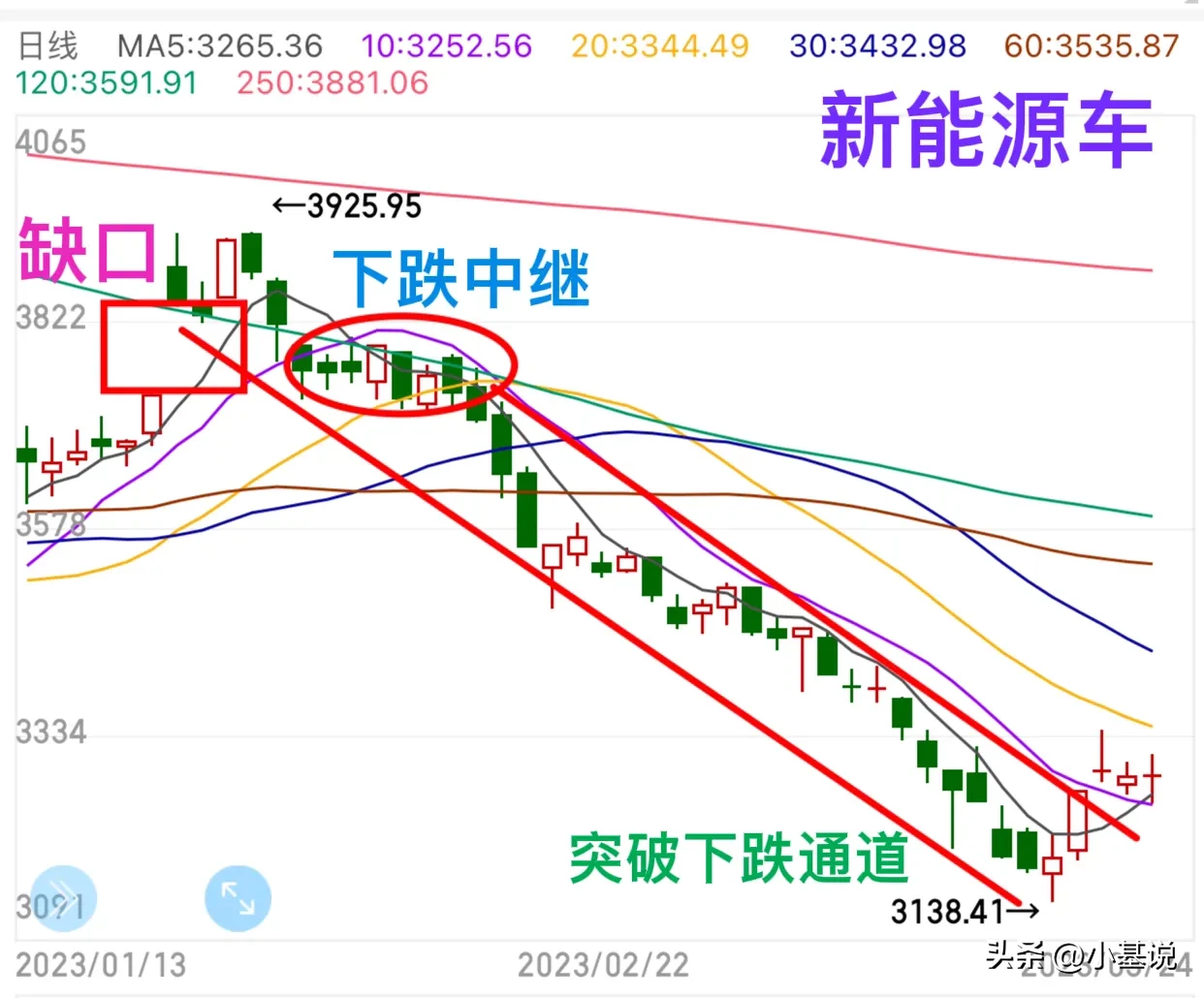 14.参照图️4、新能源车缩量回踩5日线,日线MACD金叉,红柱放大,自2月份大幅缺口高开以来,已严重超跌,日线MACD底背离,目前还在超跌反弹逻辑中,并未进入反转。