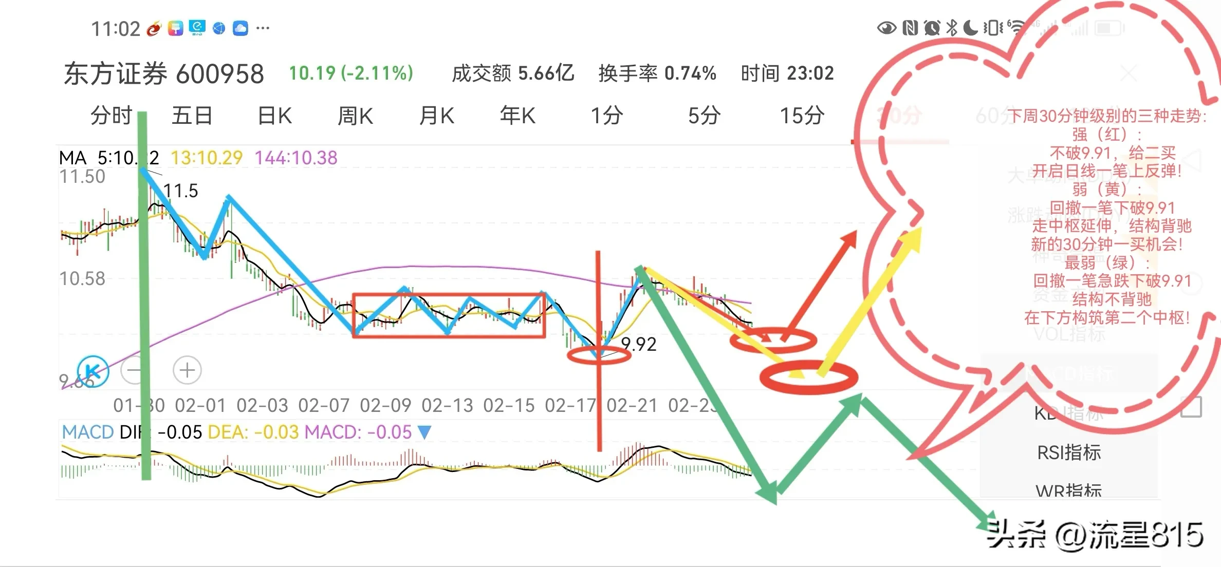 12.结论及下周预期:东方下周有望止跌企稳,强势的话:在9.91上方企稳回升,开启日线一笔上;弱势的话:缓慢跌破9.91也是加仓的时机!最弱的走势是下周初出现急跌,跌破9.91后回抽不能进去上方中枢(低位10.14),则调整周期和幅度会加大。