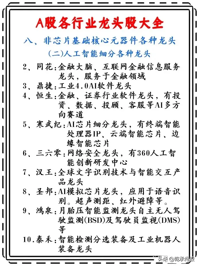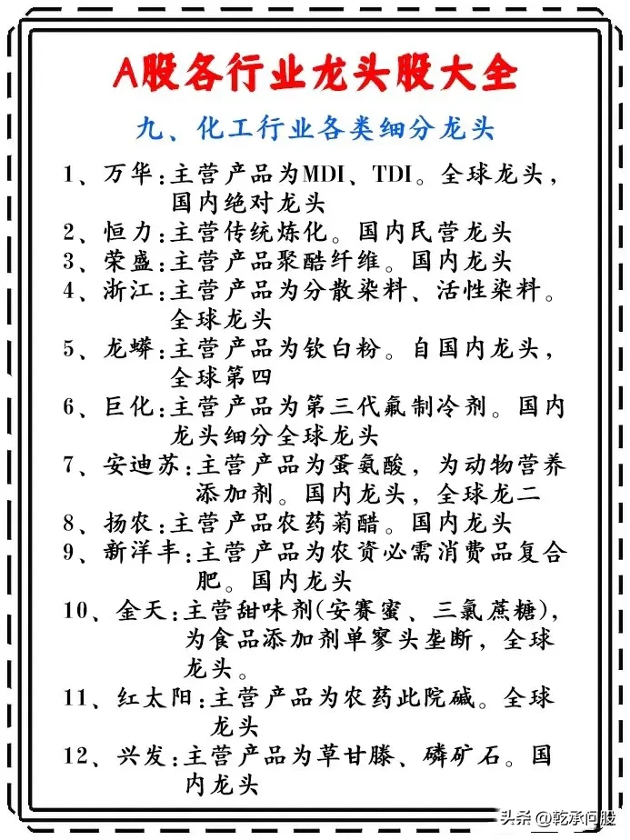7.而此时注册制的推行落地,无疑也将大大提升龙头企业的市场价值,优剩劣汰将进一步分化,不论机构或者主力,在选股的时候,都会优先配置,我们只需搭个便车就好!趁着周末时间宽裕,乾承整理了各个行业的龙头公司名单,绘制成图片,方便大家保藏收藏,闲暇之时可以花时间研究筛选,如果觉得有用,记得给老乾点赞加关注,也可以转发给你身边炒股的朋友。