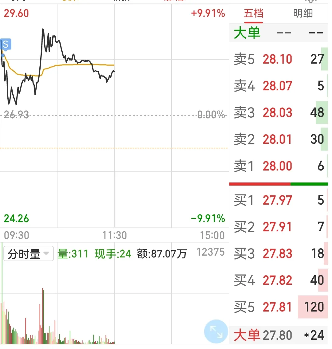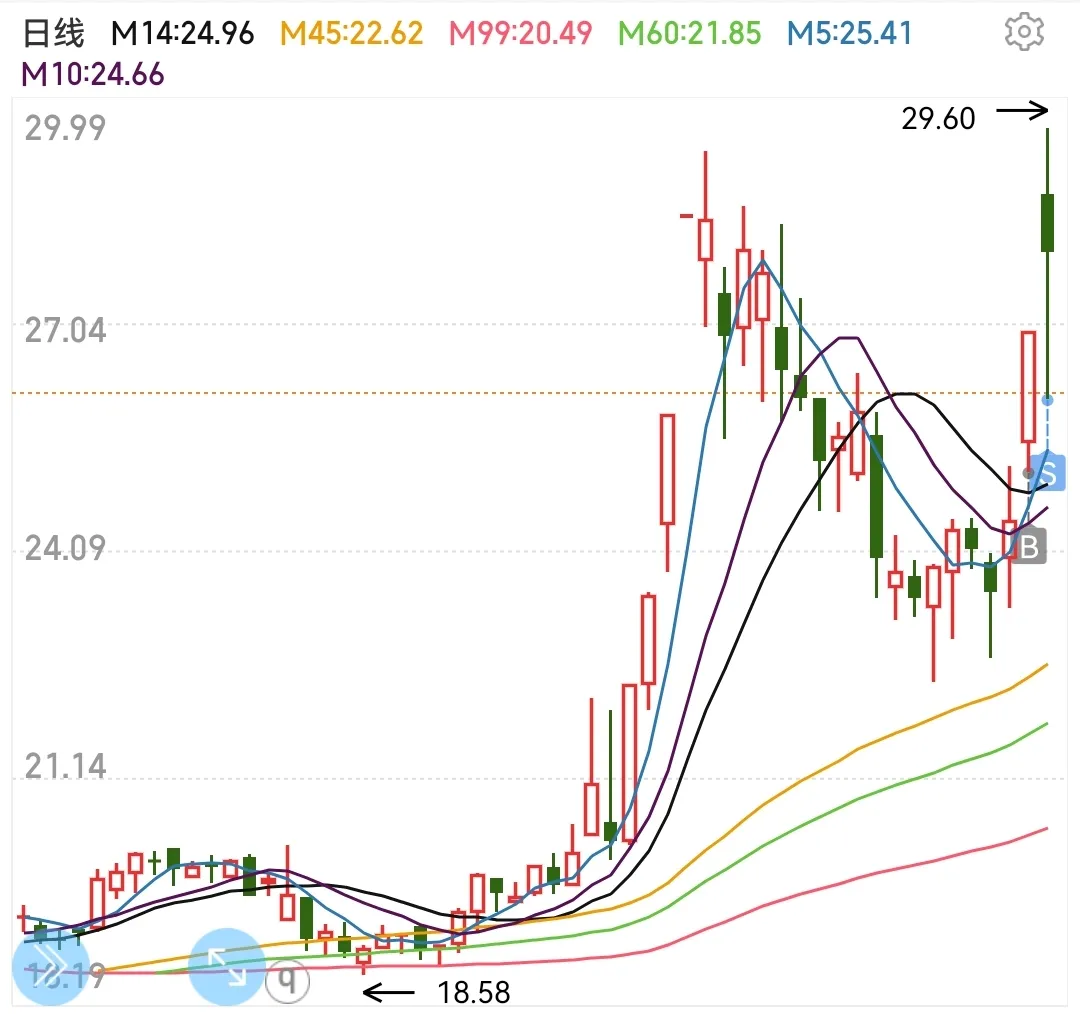 2.今天开盘价28.73元,最高冲到29.60,我在9点32分时候28.37元卖出。