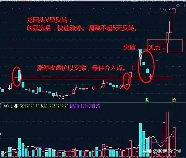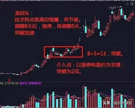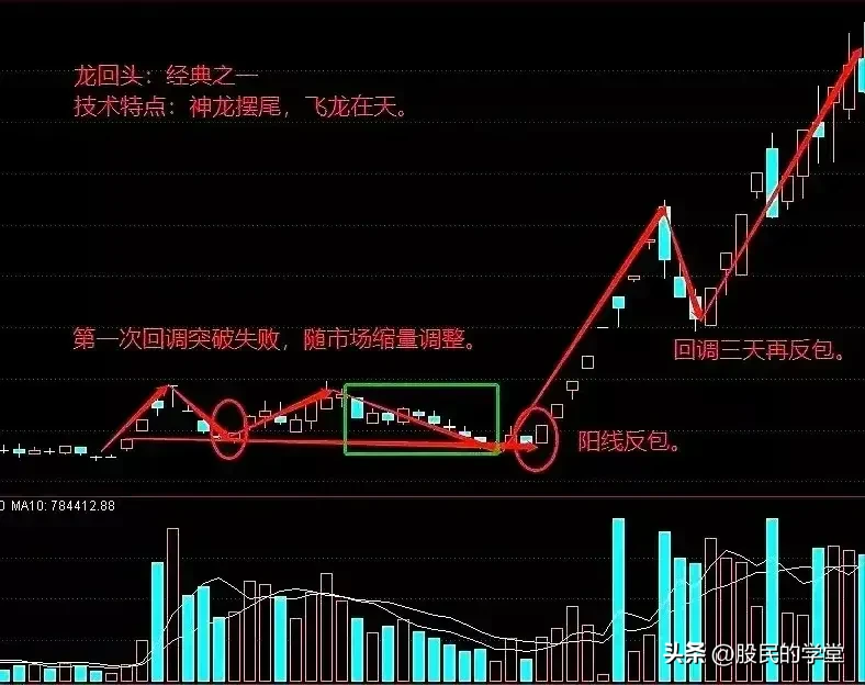 5.龙回头图形特点:一是前期强势起动,都有无量板;二是缩量回踩不破关键支撑位;三是目标品种具有一定的题材支持。