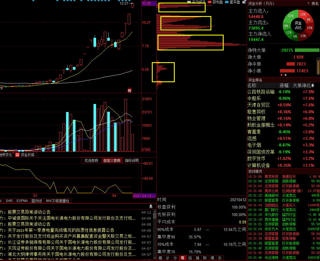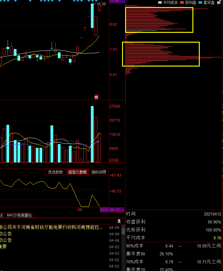 筹码分析:它的筹码明显有两个部分,我们自下而上的看,上次我们就通过筹码分析,推导了它可能会面临整理,以及整理后会有反击的机会,主要是因为第一部分筹码属于底部震荡筹码这部分比较多,第二部分筹码是前期追高筹码,整理低吸筹码以及当前追高筹码,综合起来看,在豫能强势的时候大家目标是一致的都会拿,但是一旦豫能发生走弱,就容易形成合力的泄气,但由于它本身筹码分散,泄气后会存在反复机会,重点应该看10天线的重要支撑。
