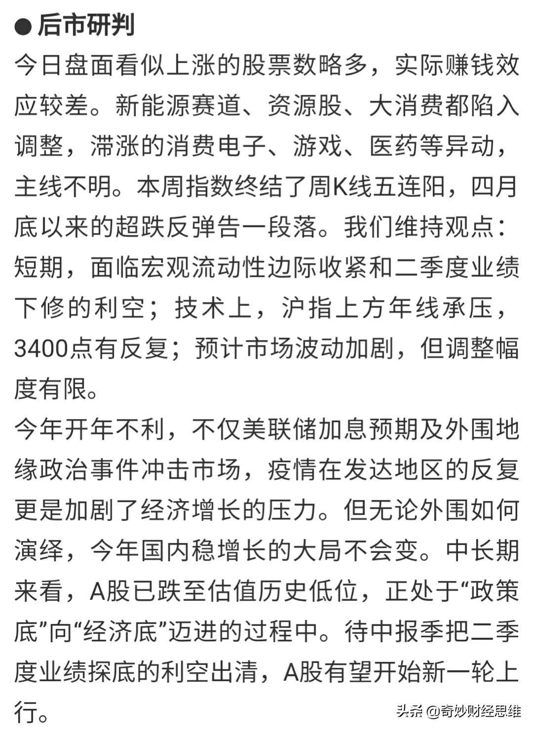 [浮云]1.腰哥财经(88.4万粉):后市应对依然是五层仓位在场,等待宏观层面消息。短期震荡不可控,成交量下坠;中长期机会大于风险。个人倾向于白酒、基建、金融板块。(周五收评观点)