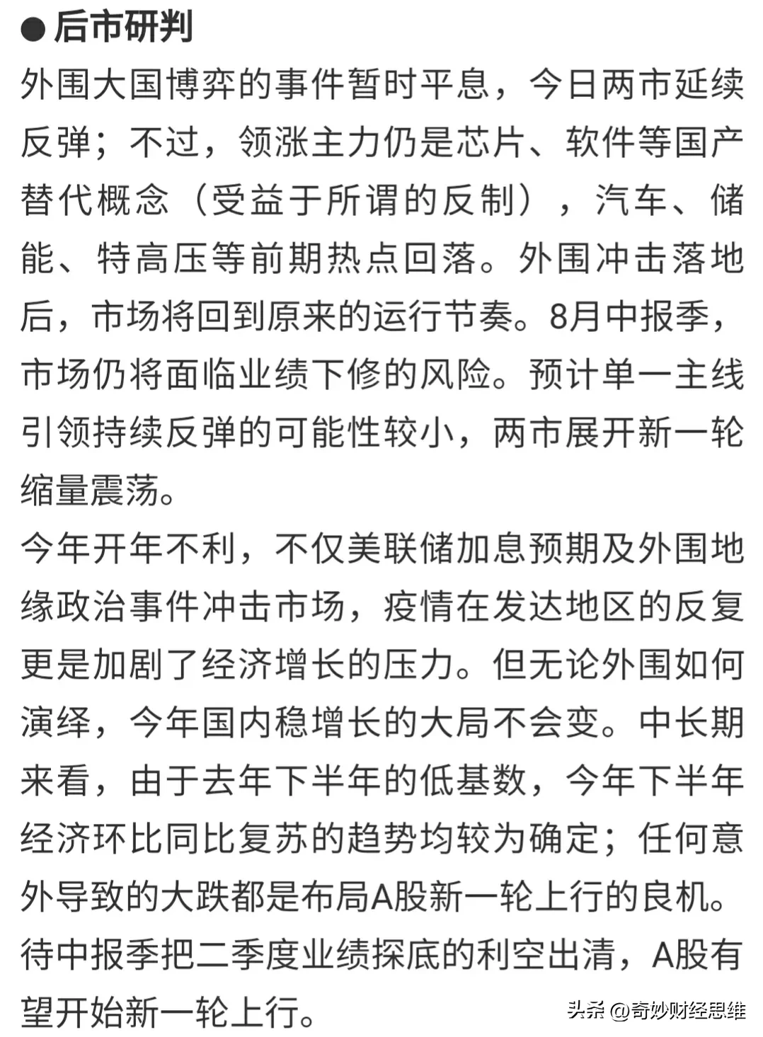 1.周末消息风起云涌,8月8号下周一股市明确涨跌预判:(周排名已更新)“精选头条最具参考价值的‘八大股评’,记录分析每日‘预判观点’ ”[沙尘暴]1.刘昌松(81.5万粉):下周上证指数支撑为3144±20点,向上短期没有高度,冲高返回落,重点规避前期热门板块,找低位板块观察,再创新低,过了5浪过后就可以全面布局。
