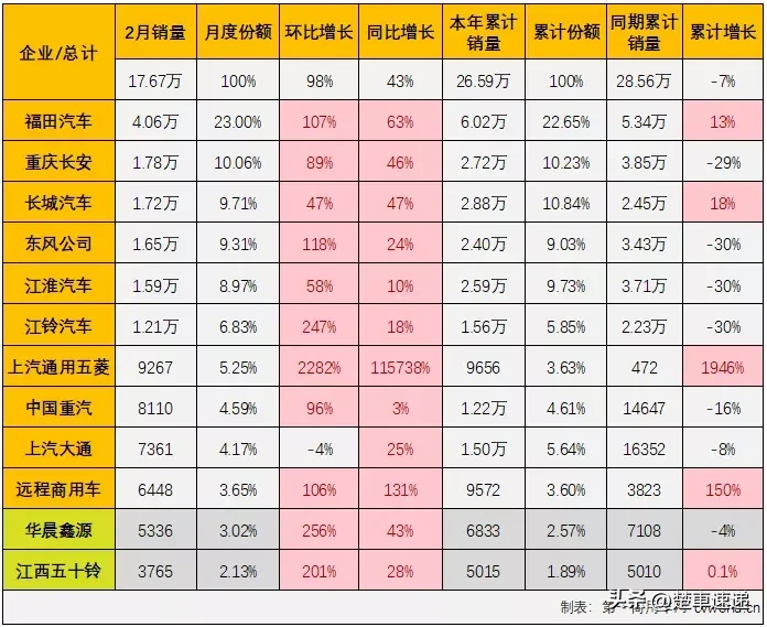 10.不过DFAC东风汽车股份有限公司(股票简称东风汽车)在2月销量成绩确实不错,我们来看看2月份国内轻、皮卡销量排行———如图一所示,东风轻、皮卡销量排名前四,共计1.65万辆,同比增长24%,环比增长118%,环比高于前三家公司,这个成绩仅次于福田、长安、长城。