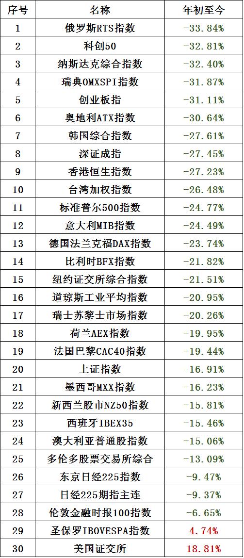 1.今年以来,全球主要股市指数跌幅排名:第一名,俄罗斯RTS指数,今年跌幅约-33.84%;第二名,科创50,今年跌幅约-32.81%;第三名,纳斯达克综合指数,今年跌幅约-32.40%;第四名,瑞典OMXSPI指数,今年跌幅约-31.87%;第五名,创业板指,今年跌幅约-31.11%;第六名,奥地利ATX指数,今年跌幅约-30.64%;第七名,韩国综合指数,今年跌幅约-27.61%;第八名,深证成指,今年跌幅约-27.45%;第九名,香港恒生指数,今年跌幅约-27.23%;第十名,台湾加权指数,今年跌幅约-26.48%;第十一,标准普尔500指数,今年跌幅约-24.77%;第十二,意大利MIB指数,今年跌幅约-24.49%;第十三,德国法兰克福DAX指数,今年跌幅约-23.74%;第十四,比利时BFX指数,今年跌幅约-21.82%;第十五,纽约证交所综合指数,今年跌幅约-21.51%;第十六,道琼斯工业平均指数,今年跌幅约-20.95%;第十七,瑞士苏黎士市场指数,今年跌幅约-20.26%;第十八,荷兰AEX指数,今年跌幅约-19.95%;第十九,法国巴黎CAC40指数,今年跌幅约-19.44%;第二十,上证指数,今年跌幅约-16.91%;全球股市都不容易,其中,俄罗斯指数跌幅领衔全球,我们A股指数跌幅也算是比较靠前。