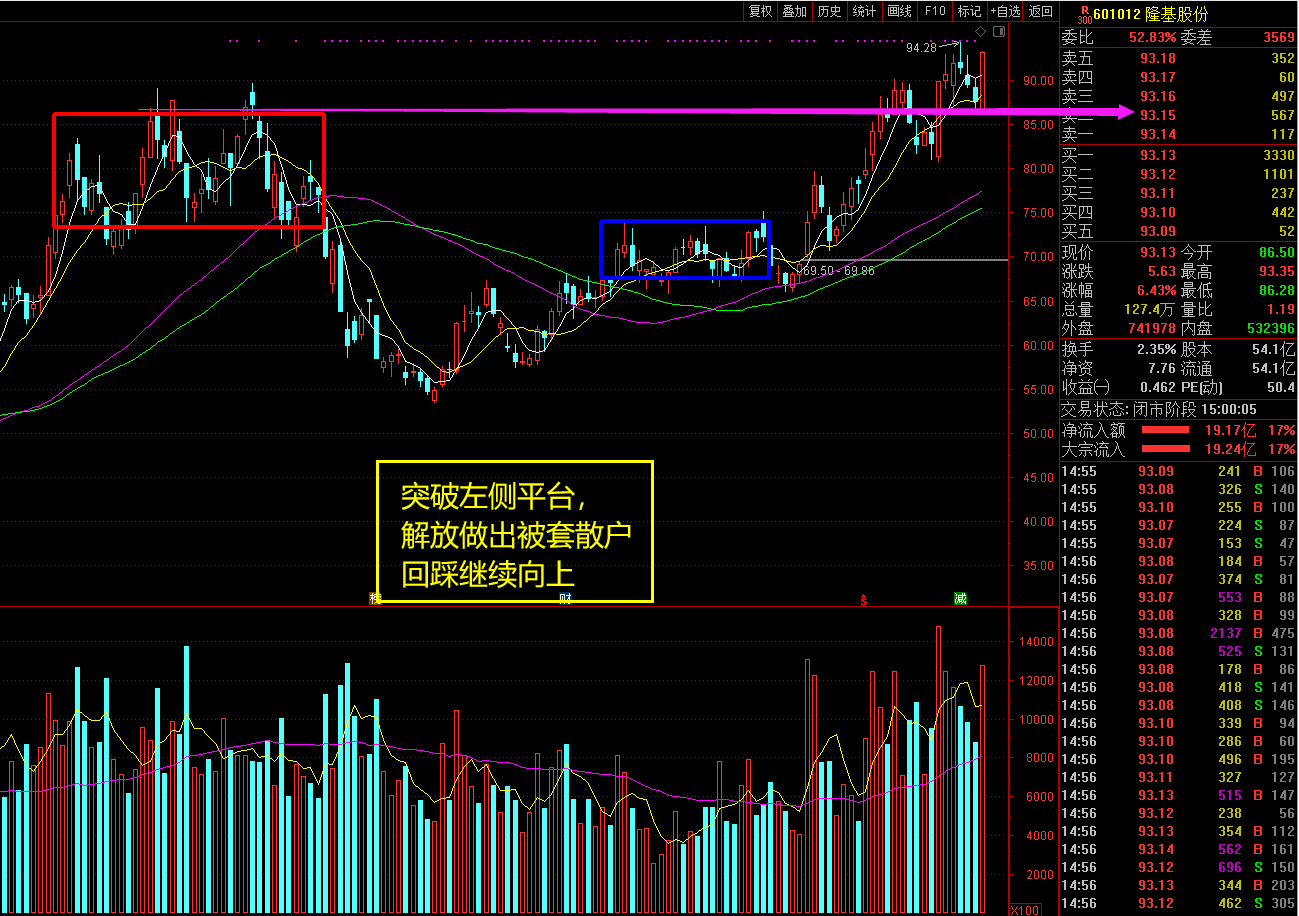 对于光伏板块我在前几天的收盘观点中给大家重点阐述过,龙头隆基放量突破历史新高后在平台上方震荡,量价关系和行业景气度都非常好,多头的趋势没有改变,今天隆基大涨6%,晶澳股份、上机数控等纷纷涨停,可喜可贺!