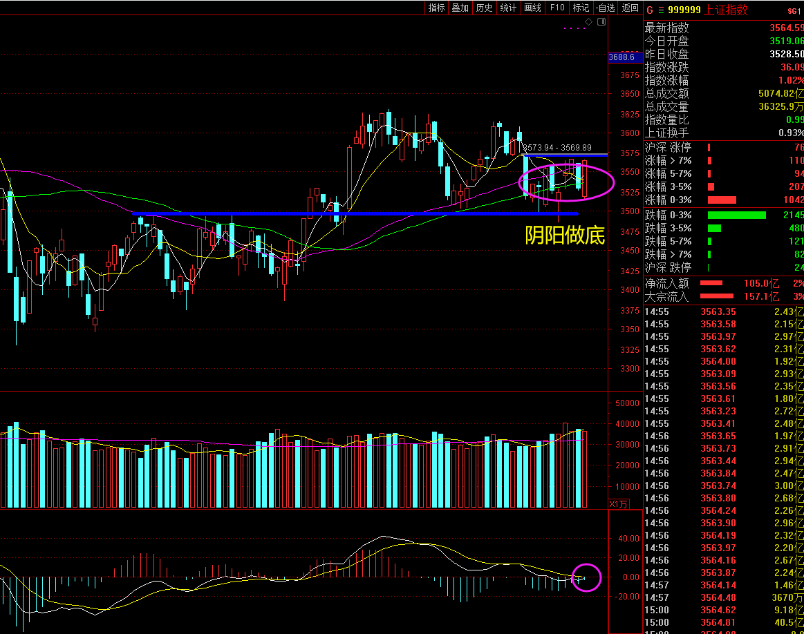 昨天指数一根中阴线直接向下,我给大家的观点非常清晰就是筑底行情,下方3500点一线的支撑是不可能被跌破的;今天指数在权重板块的带动出现低开高走,走出缩量反包结构,是否让你一阳改三观呢?