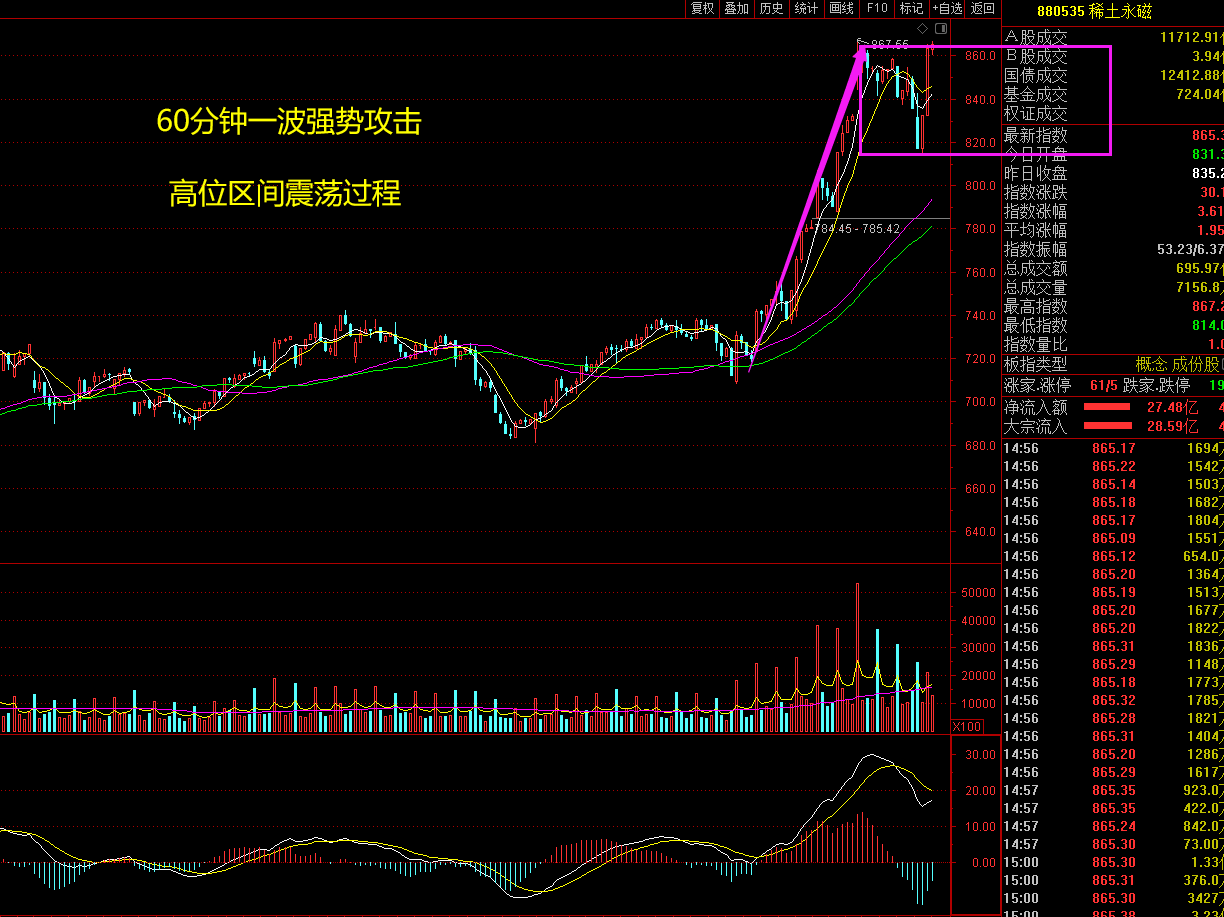 我一直讲一句话下跌诛心,大跌的时候总是让人迷失自我,昨天锂电池和稀土调整的时候相信大多数人都担心;下昨天的收盘中我给大家说了,虽然锂电池出现了警示K线,但是由于市场主力参与力度太深,必须要有反复段,主力不可能通过一根K线出货;