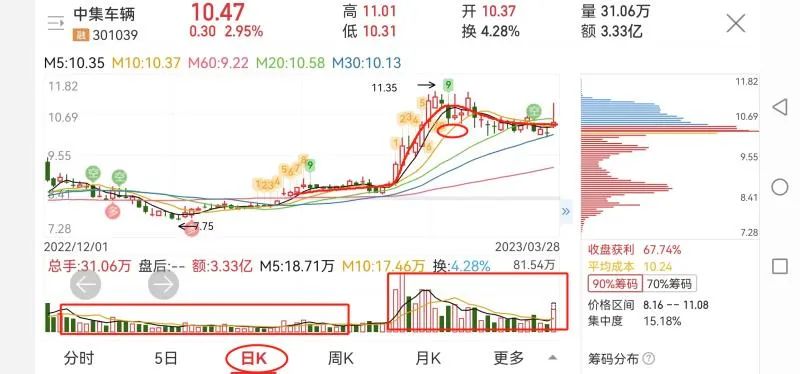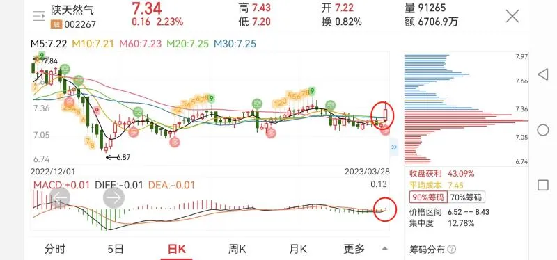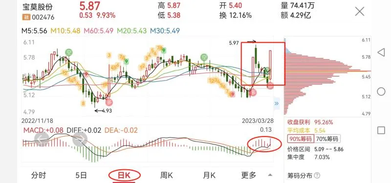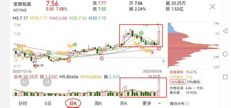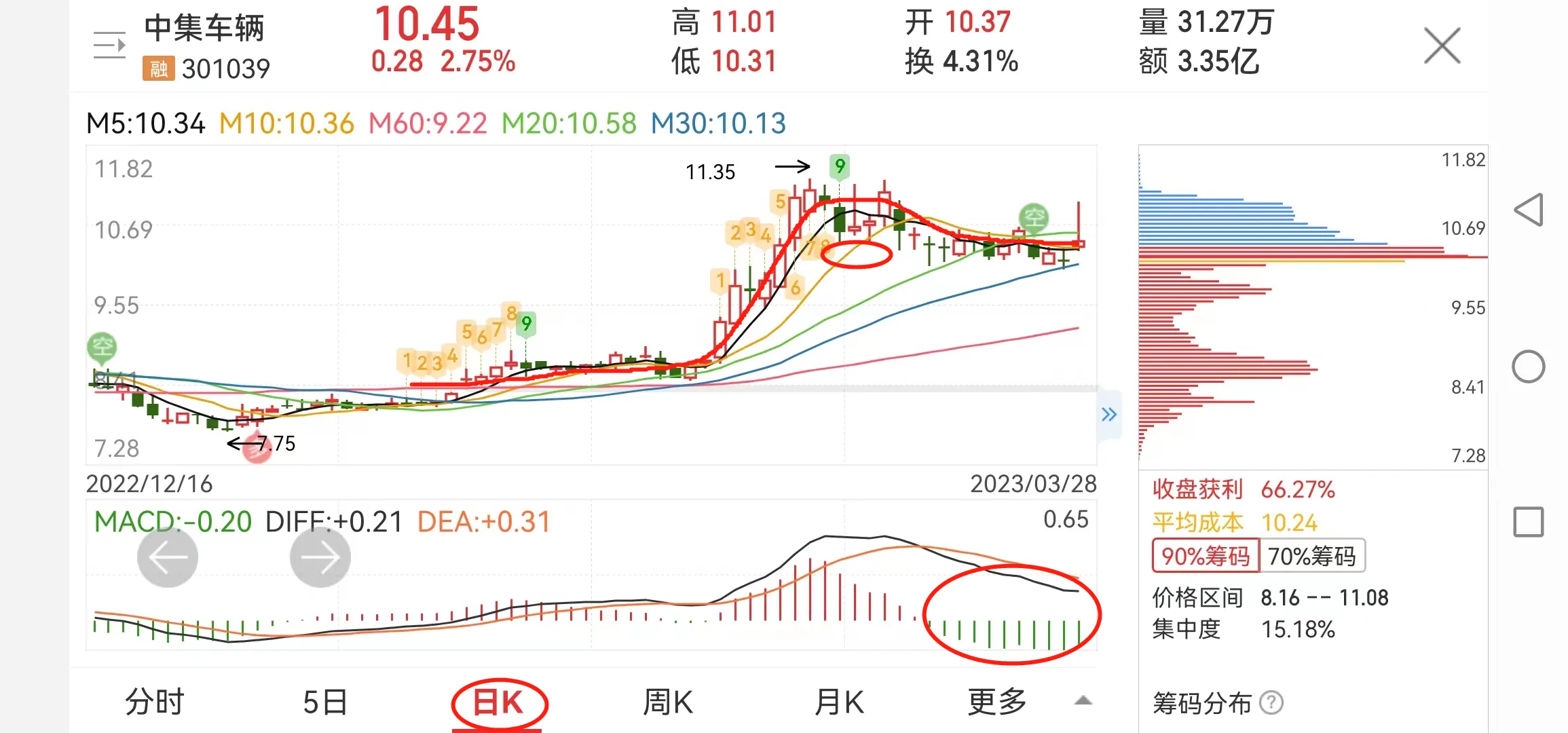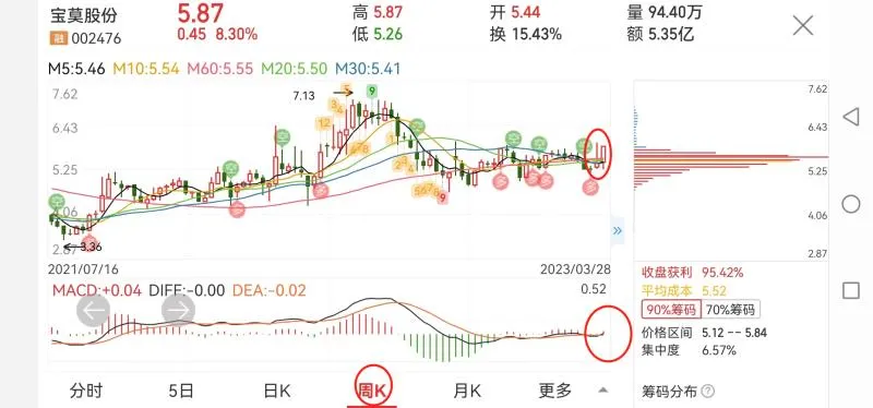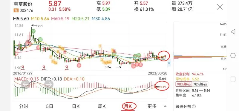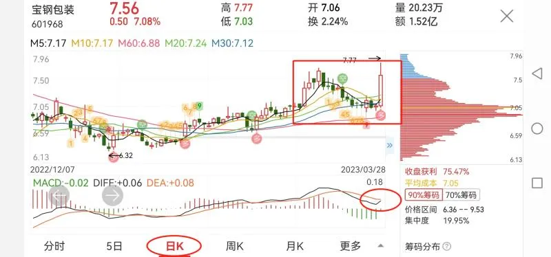 2.今天MACD、KD、KDJ同时金叉,值得关注; 2、002476 宝膜股份 该股票3月20日涨停后,连续缩量调整了5天,但没有跌破涨停板底部,今天放量上涨,说明主力资金再次介入,MACD在零轴上方,KD金叉,周线,MACD、KD、同时金叉,均线呈多头排列; 3、601968 宝钢包装该股票出现“低9”序列形态后,紧接着出现了“底分型”形态,底部是否预示着启稳了呢,今天主力资金净流入1340多万,MACD己从水下慢慢上升到零轴且将金叉,KD金叉,KDJ己拐头向上,5日线上穿10日线,股价己达前期高点,接下来的走势值得关注; 4、301039 中集车辆该股票的走势似老鸭头图形,今日5日均线上穿10日均线,KD金叉,MACD绿柱在逐渐缩短,KDJ己开始拐头向上,均线即将呈多头排列,今天有主力资金介入,近5日资金呈净流入状态,如果接下来走出老鸭头形态,果断上车;