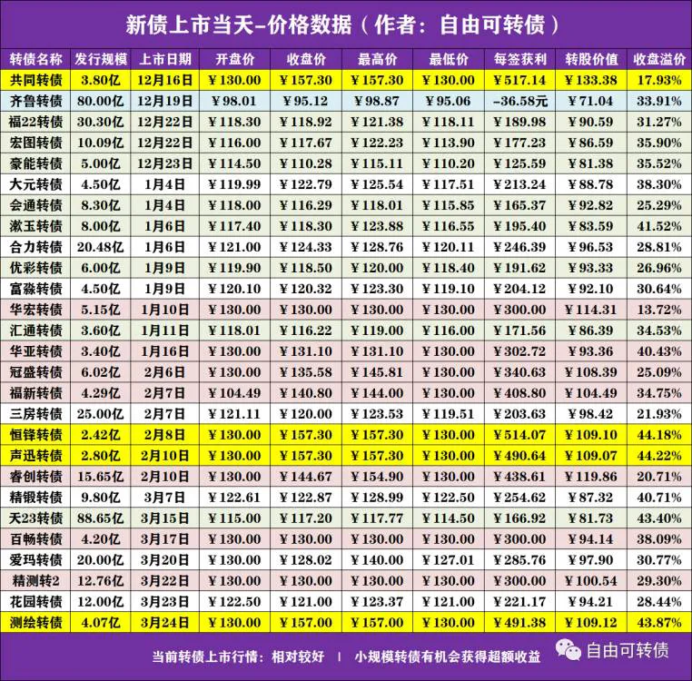 新债上市行情:近期上市的27只转债,共有“共同转债、华宏转债、华亚转债、冠盛转债、福新转债、恒锋转债、声迅转债、睿创转债、百畅转债、精测转2、测绘转债”的每签(每手/每10张)获利高于300元。其中“齐鲁转债”上市当天破发。