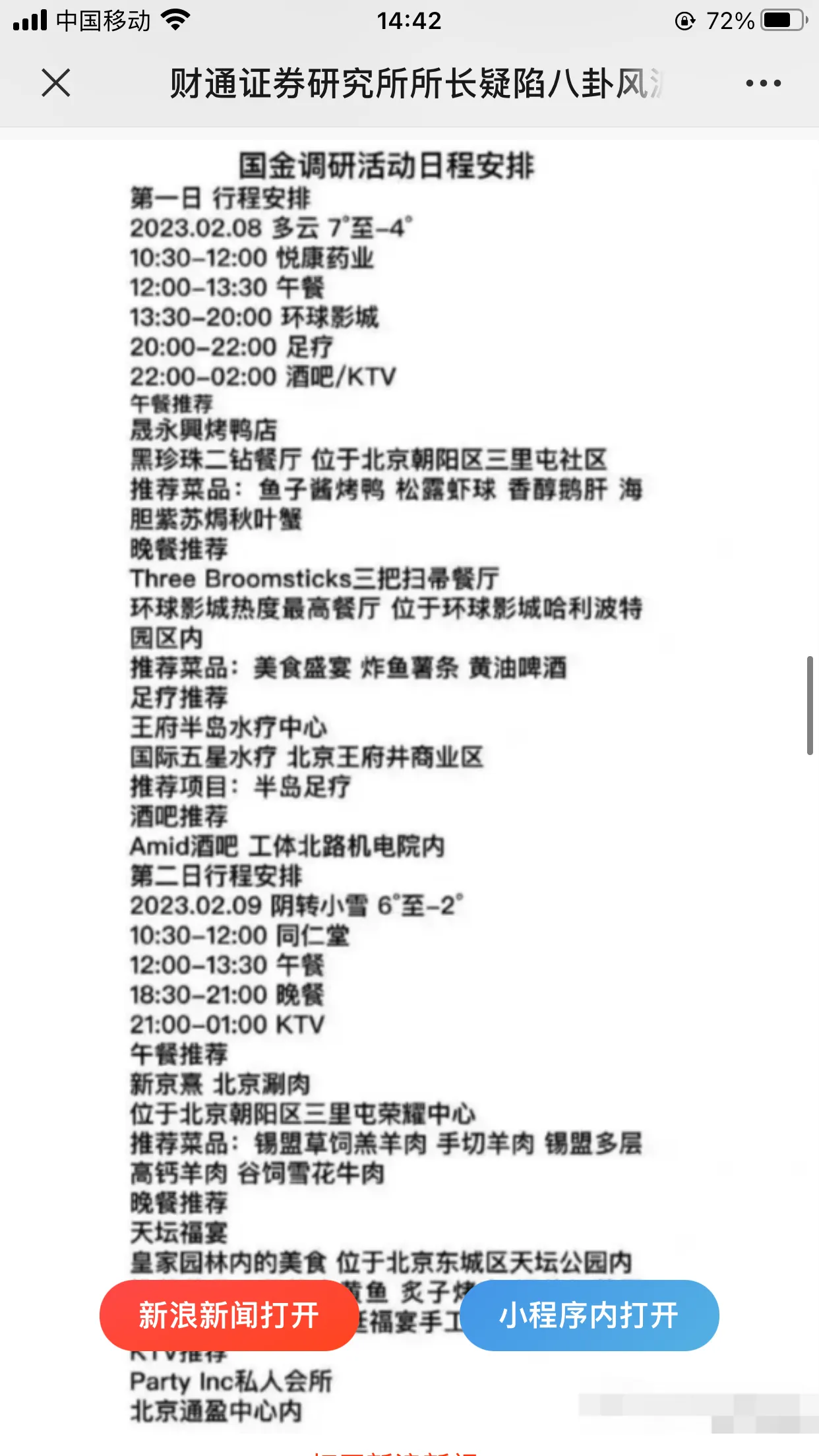 10.现在也真是防控结束真的开放了,证券公司真是先行指标,除了安信证券这个酒局,还有国金证券赴悦康药业、同仁堂两家上市公司的调研活动行程表,两天调研也就三四个小时,其实场合就是酒吧、私人会所、环球影城、半岛足疗、荣耀中心涮肉,整个消费端市场强烈复苏与繁荣。