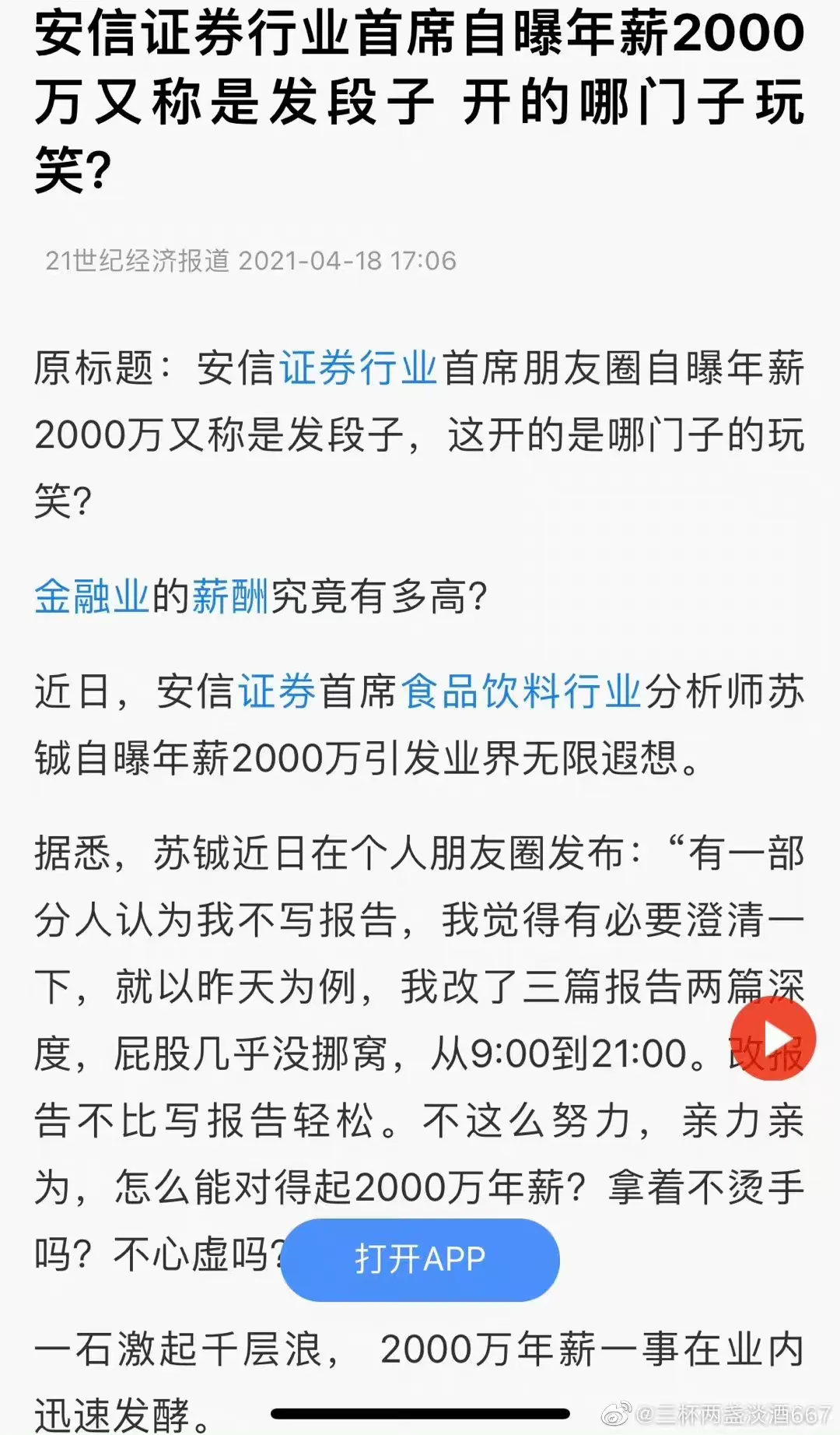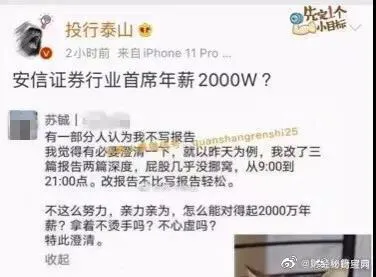 6.看看两年前大年前,安信证券行业首席苏铖个人朋友圈自曝光年薪2000万,累成狗:“有一部分人认为我不写报告,我觉得有必要澄清一下,就以昨天为例,我改了三篇报告两篇深度,屁股几乎没挪窝,从9:00到21:00。