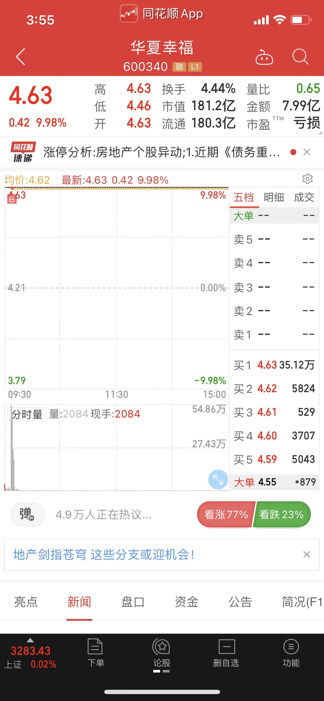 2.个人操作:今天打板了市场一阶梯队房地产中的小弟华夏幸福,之所以打它就是因为房地产在接下来一周内的延续潜力,而华夏幸福早盘高开后直接T字板涨停,回封力度很强势,资金流入很大,从情绪上看有望在上一阶梯,本来想打中国武夷的,但是开盘直接一字版,不给机会进啊,华夏幸福挂的涨停价打板,本来是以为成交不了,没想到板被砸开了个小口子,好在回封承接的力度强,不然这个板没回封上,至少得吃八个点以上的大面