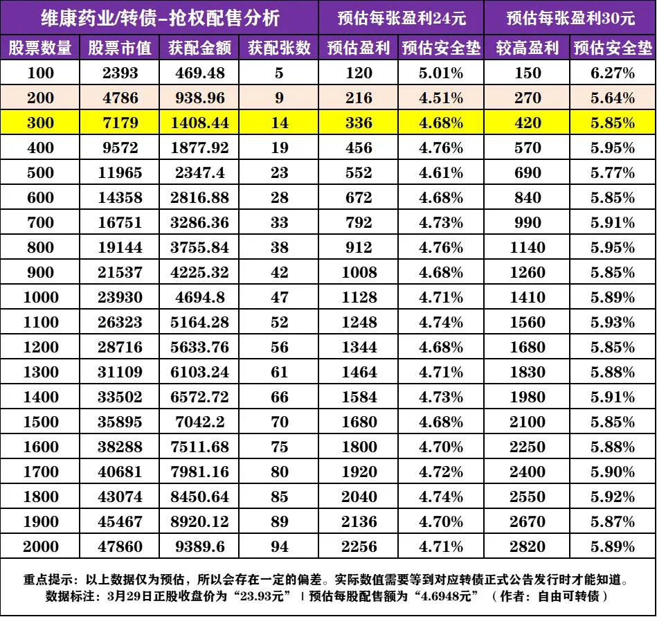 预估每股配售额为4.6948元,买入300股“维康药业”的股票,未来“大概率”可获配14张转债。买入200股的情况下,未来“大概率”可获配9张转债。