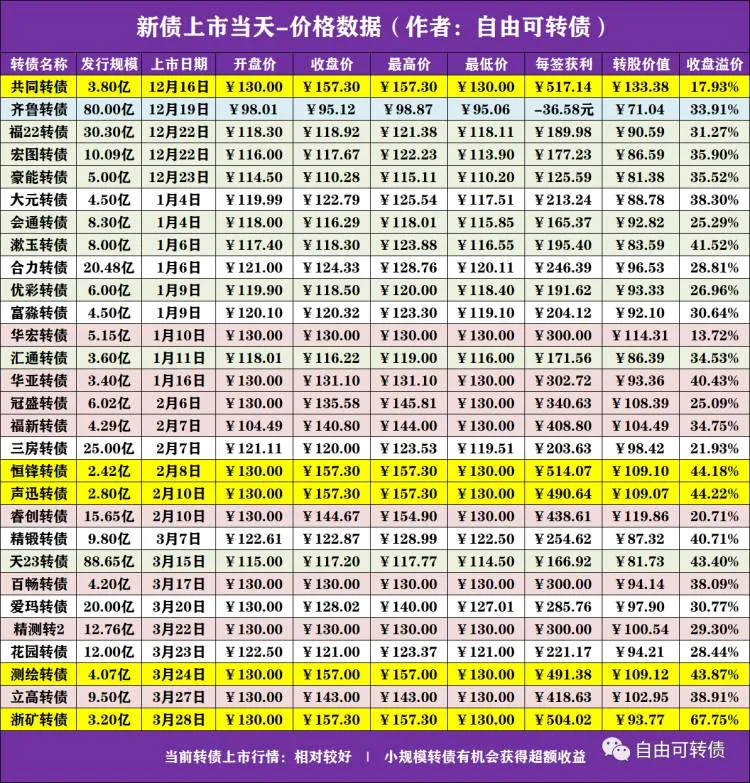 新债上市行情:近期上市的29只转债,共有“共同转债、华宏转债、华亚转债、冠盛转债、福新转债、恒锋转债、声迅转债、睿创转债、百畅转债、精测转2、测绘转债、立高转债、浙矿转债”的每签(每手/每10张)获利高于300元。其中“齐鲁转债”上市当天破发。
