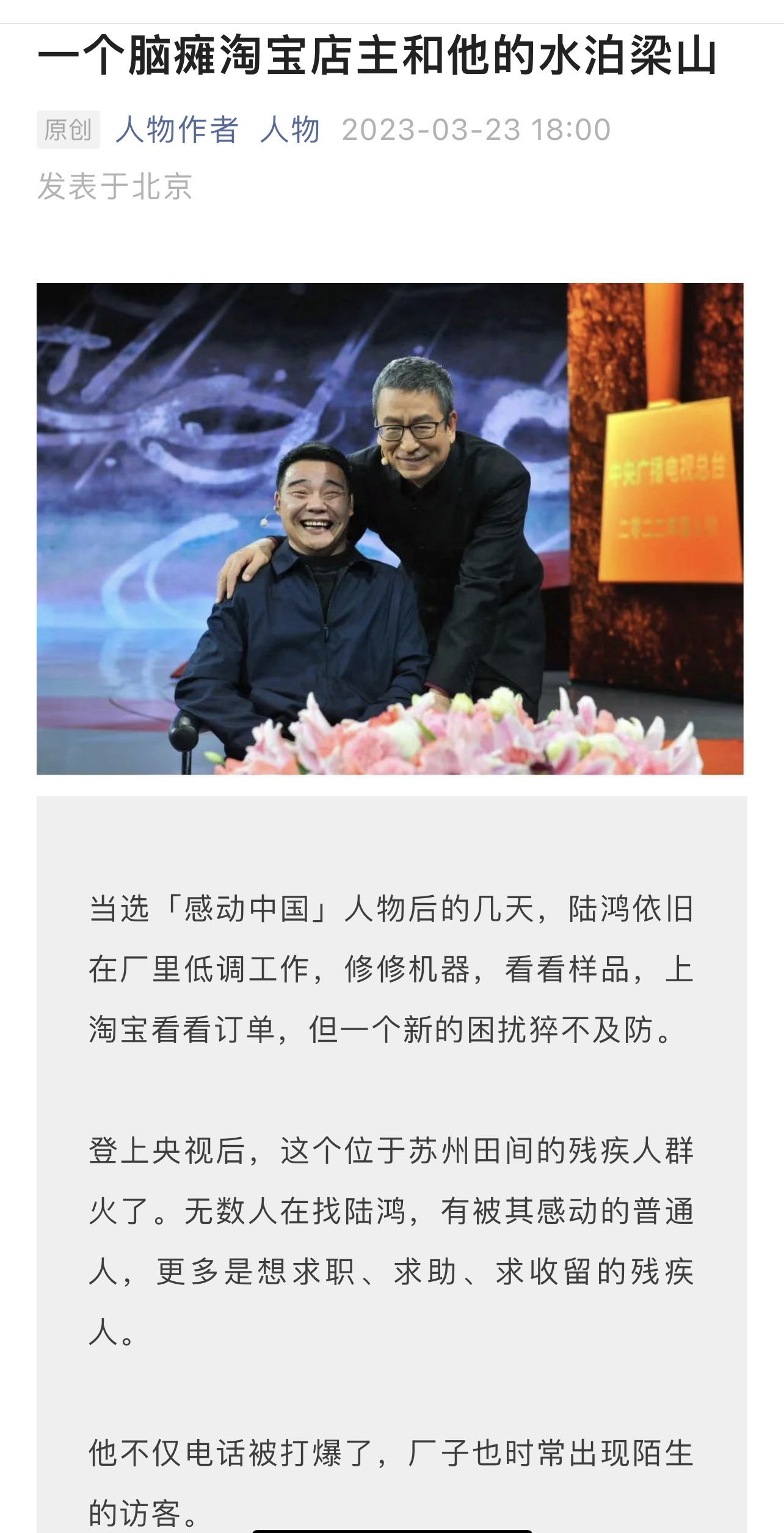 3.看了《人物》这篇《一个脑瘫淘宝店主和他的水泊梁山》,我看到一个更加完整的陆鸿。