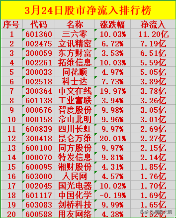 1.主力净流入:3月24日股市主力净流入排行榜,看看有没有你的持仓股:今日沪深两市主力机构净流入前20大个股排行榜:序号 代码 名称 涨跌幅 净流入1 601360 三六零 10.03% 11.20亿2 002475 立讯精密 6.72% 7.19亿3 300059 东方财富 3.53% 6.51亿4 002261 拓维信息 10.03% 5.59亿5 300033 同花顺 4.97% 5.05亿6 002518 科士达 7.73% 3.89亿7 300364 中文在线 19.97% 3.78亿8 601138 工业富联 3.94% 3.26亿9 000676 智度股份 9.98% 3.05亿10 000158 常山北明 9.96% 3.01亿11 600839 四川长虹 9.97% 2.69亿12 300418 昆仑万维 20.01% 2.27亿13 600100 同方股份 9.97% 2.15亿14 000070 特发信息 9.81% 2.14亿15 600095 湘财股份 4.31% 1.85亿16 603000 人民网 4.57% 1.76亿17 002045 国光电器 10.02% 1.70亿18 601117 中国化学 -0.19% 1.69亿19 603083 剑桥科技 9.99% 1.65亿20 600588 用友网络 4.38% 1.52亿更多请关注