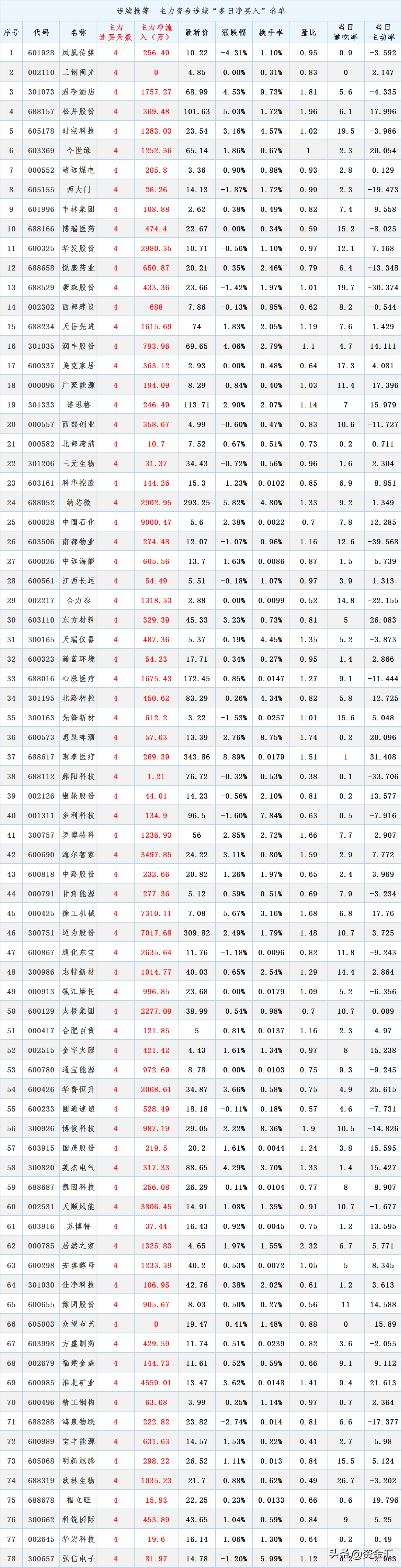 3.具体清单如下:序号 名称 “主力连买天数”1 凤凰传媒 42 三钢闽光 43 君亭酒店 44 松井股份 45 时空科技 46 今世缘 47 靖远煤电 48 西大门 49 丰林集团 410 博瑞医药 411 华发股份 412 悦康药业 413 豪森股份 414 西部建设 415 天岳先进 416 润丰股份 417 美克家居 418 广聚能源 419 诺思格 420 西部创业 421 北部湾港 422 三元生物 423 科华控股 424 纳芯微 425 中国石化 426 南都物业 427 中远海能 428 江西长运 429 合力泰 430 东方材料 431 天瑞仪器 432 瀚蓝环境 433 心脉医疗 434 北路智控 435 先锋新材 436 惠泉啤酒 437 惠泰医疗 438 鼎阳科技 439 银轮股份 440 多利科技 441 罗博特科 442 海尔智家 443 中路股份 444 甘肃能源 445 徐工机械 446 迈为股份 447 通化东宝 448 志特新材 449 钱江摩托 450 太极集团 451 合肥百货 452 金字火腿 453 通宝能源 454 华鲁恒升 455 圆通速递 456 博俊科技 457 国茂股份 458 英杰电气 459 凯因科技 460 天顺风能 461 苏博特 462 居然之家 463 安琪酵母 464 仕净科技 465 豫园股份 466 众望布艺 467 方盛制药 468 福建金森 469 淮北矿业 470 精工钢构 471 鸿泉物联 472 宝丰能源 473 明新旭腾 474 欧林生物 475 福立旺 476 科锐国际 477 华宏科技 478 弘信电子 479 晨光股份 380 洋河股份 381 人人乐 382 安泰集团 383 白云机场 384 辉隆股份 385 北新路桥 386 西上海 387 聚合顺 388 皖通高速 3后续见图表点赞、转发是莫大的支持!