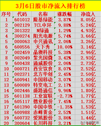 1.主力净流入:3月6日股市主力净流入排行榜,看看有没有你的持仓股:今日沪深两市主力机构净流入前20大个股排行榜:序号 代码 名称 涨跌幅 净流入1 601012 隆基绿能 3.87% 8.05亿2 002129 TCL中环 9.88% 5.24亿3 301322 N绿通 1.29% 4.93亿4 300274 阳光电源 5.74% 3.66亿5 000063 中兴通讯 2.06% 3.26亿6 600556 天下秀 10.00% 3.14亿7 002459 晶澳科技 5.38% 2.96亿8 002049 紫光国微 3.42% 2.93亿9 600438 通威股份 2.06% 2.73亿10 000721 西安饮食 8.07% 2.52亿11 002371 北方华创 2.45% 2.50亿12 600941 中国移动 3.07% 2.00亿13 600089 特变电工 2.17% 1.93亿14 002446 盛路通信 9.96% 1.80亿15 601138 工业富联 -2.73% 1.77亿16 605117 德业股份 7.45% 1.73亿17 601390 中国中铁 -1.35% 1.53亿18 600988 赤峰黄金 2.52% 1.51亿19 600732 爱旭股份 3.86% 1.44亿20 300604 长川科技 3.21% 1.44亿更多请关注